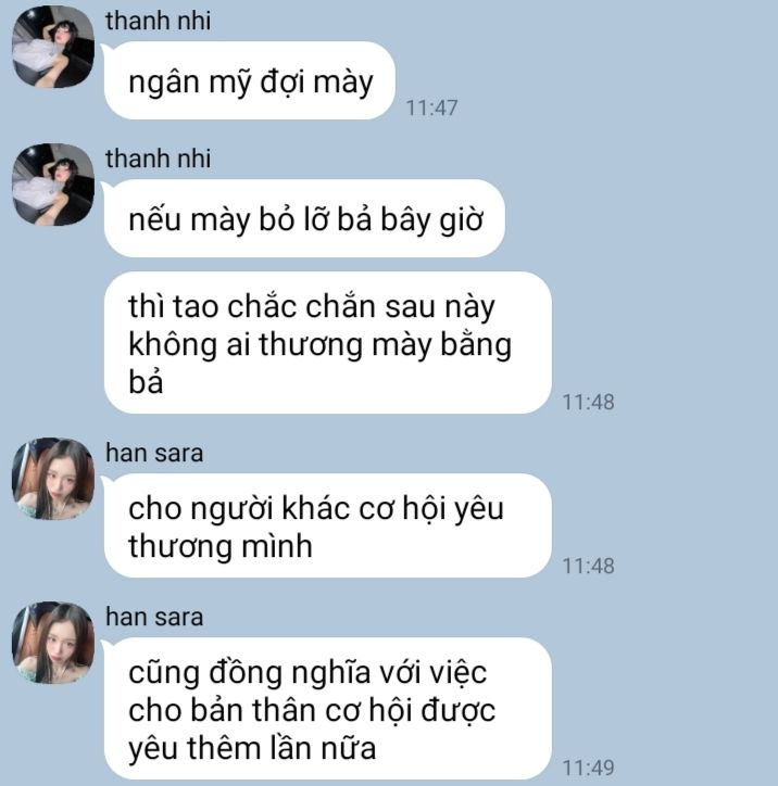 "em không sai, chuyện này cũng chẳng phải lỗi do ai, bây giờ em cứ thẳng thắn nói với con bé đó, chị biết là khó, nhưng như thế mới có thể giải quyết mọi chuyện, em có thể đường đường chính chính nói lời yêu với 'người kia'."- hiền mai chẳng biết, chị đang tự nói mình.