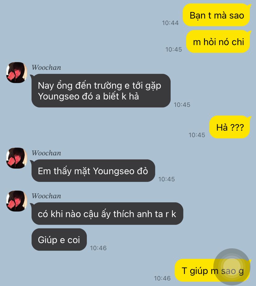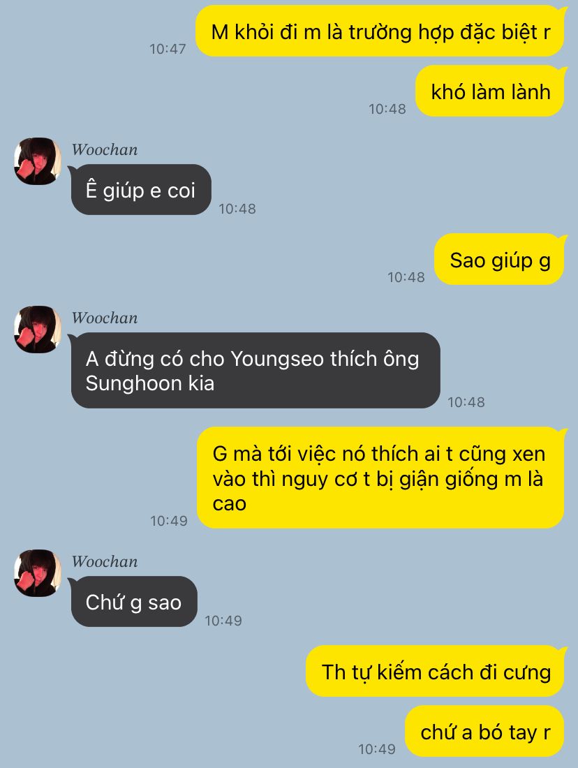 Cậu đi cùng côra bàn phía sau lưng e ngồi nhưng vì k thích nên cô nên đổi sang bàn kế bên Youngseo ngồi, em đang nói chuyện cùng với Sunghoon ánh mắt vô tình liếc sang bàn bên cạnh . Em thấy cậu bên cạnh cậu là một cô gái . Em chỉ nhìn lướt qua r th , ánh mắt em dường như k muốn để tâm đến người ngồi bàn bên.Cô em gái kia thì bắt đầu nhờ vả Woochan vốn biết cậu học giỏi nên bài nào cũng hỏi a trai cô ngôi bên cũng thấy lạ .
