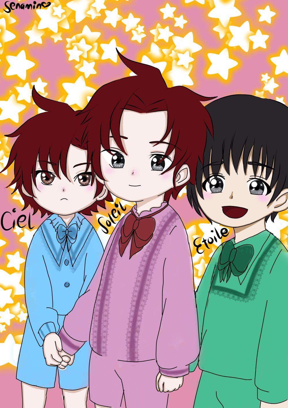 Three days before the children's birthday, the outfit they would wear finally arrived. Soleil would be wearing a cream colored outfit. Its top was a long, ruffled sleeve with big ribbon on the collar paired with shorts and knee high white socks and boots. For Etoile, he would be wearing a combination of cream and red sailor outfit. The top was long sleeves as well with ribbons on the collar, the pattern of the color was red on the sides and cream on the middle. This outfit was paired with red and cream shorts with matching white socks and shoes. Lastly, for Ciel, he would be wearing a combination of baby blue and white colored outfit. His top was plain white and the collar was baby blue with a big ribbon in the middle. It was also paired with baby blue shorts with ribbon on the sides. For his footwear, he would be wearing knee high socks and shoes. All of them have berets matching the color of their outfits to finish their looks.