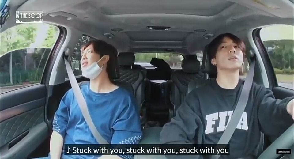 hai bạn tình đầu đi chung xe. chỉ riêng hai bạn thôi. namjoon và jungkook đã hát "stuck with you". tạm dịch thì nghĩa là "mình mắc kẹt với nhau". và hai bạn đang mắc kẹt với nhau thật. chỉ riêng hai bạn thôi ấy, nó làm mình tan chảy mất thôi.