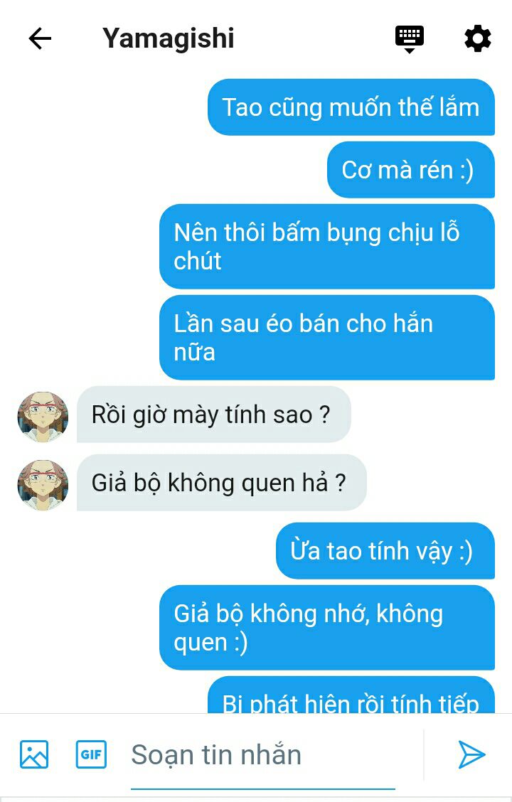 Nhớ ra rồi thì cậu nghe lời cổ nhân giấu tên nào đó đã từng nói " Có chuyện bất bình, nhanh tay nhắn tin nói cho con bạn mình nghe trước mới quyết định sau.", lập tức chạy đi nhắn tin với Yamagishi.