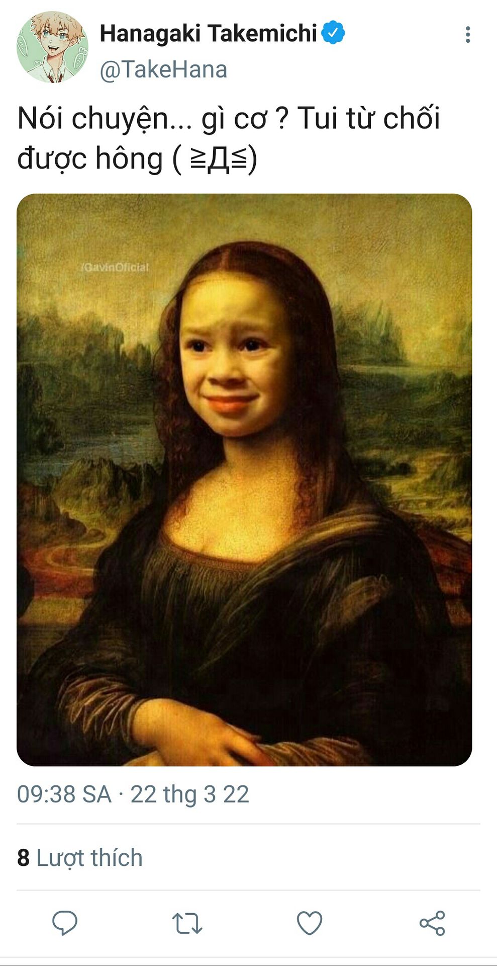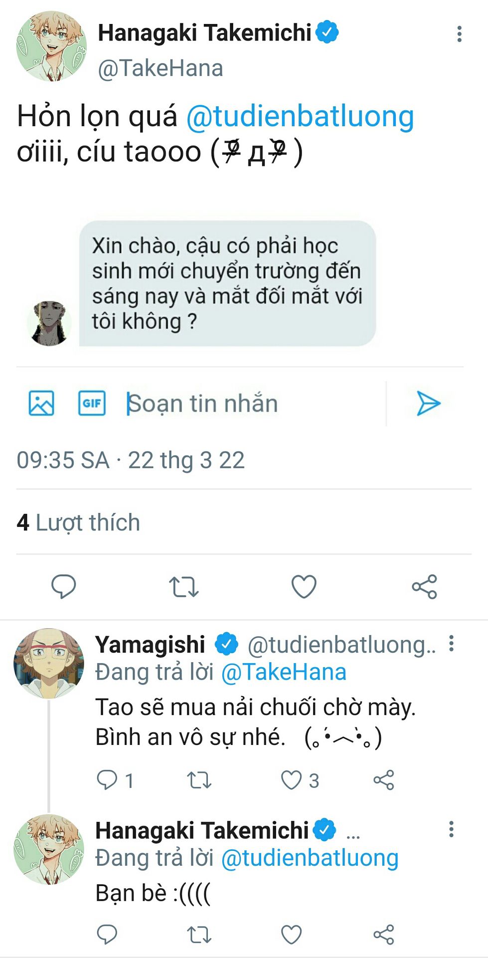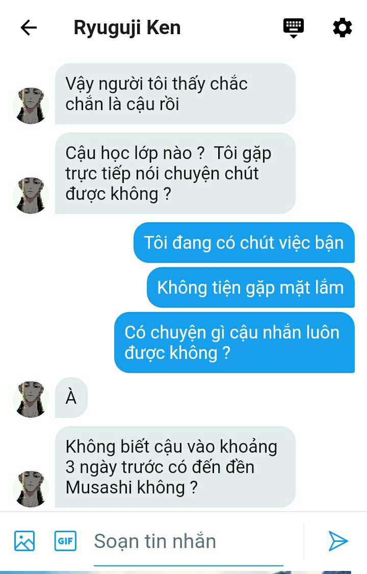 Chưa kịp trấn tĩnh lại tinh thần, thấy đến mấy chữ gặp trực tiếp Takemichi lại muốn ném điện thoại đi để không phải nhắn tiếp nữa.
