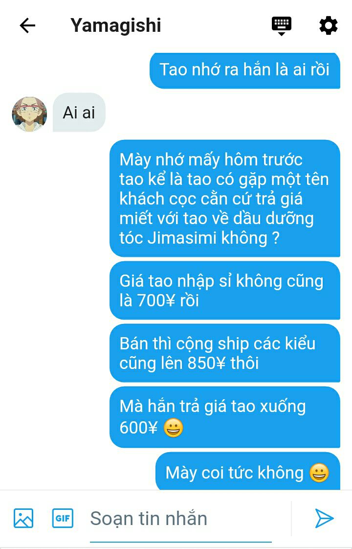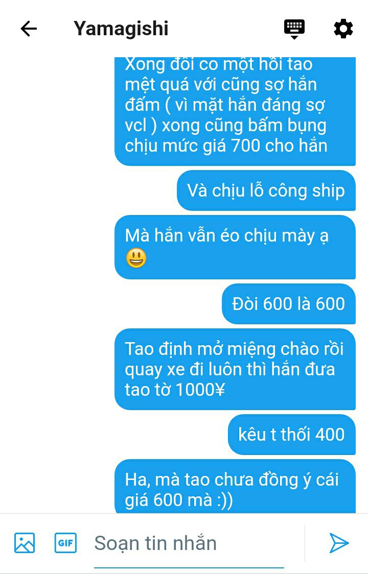 Nhưng mà nghĩ đến tiền điện thoại rất đắt đỏ và sự nghiệp kinh doanh online của mình, cậu đành phải kiềm lại sự bức bối trong lòng mình mà nhắn tiếp.