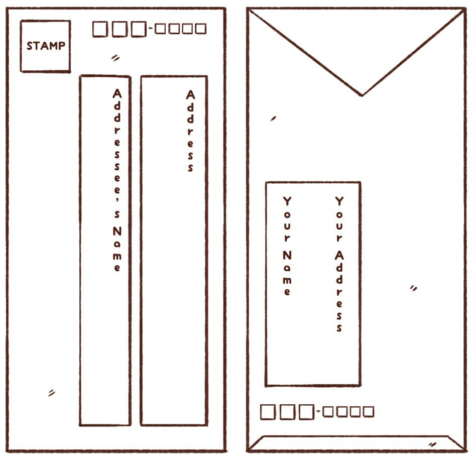 Có một số điều cần lưu ý. Bạn phải ghi mã bưu điện vào các ô trống. Ở mặt trước của phong bì, bạn sẽ viết Địa chỉ người nhận (dọc) ở bên tay phải và Tên người nhận bên tay trái, viết to hơn một chút so với địa chỉ đễ dễ phân biệt. Ở mặt sau bạn sẽ ghi Tên và Địa chỉ người gửi, kiểu cách tương tự như mặt trước, và điền mã bưu điện nếu có ô trống.