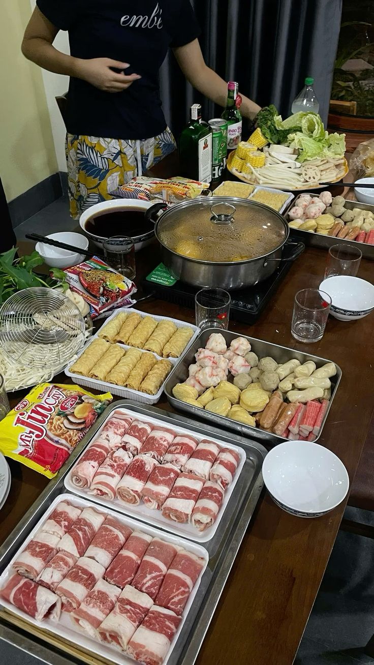 Đứng dậy vào bếp chuẩn bị nồi lẩu, bếp ga mini, bát đũa,khi mọi thứ đã đầy đủ trên bàn thì chuông cửa vang lên