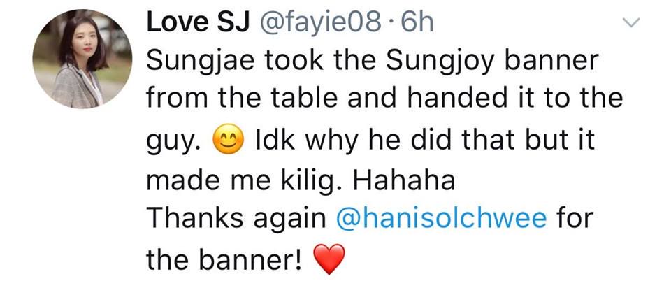 Anh ấn tượng nhất là lúc dự fansign. Một bạn fan Bbyu đến và cầm theo banner rất đáng yêu, bạn ấy nói nhiều lắm, tuy anh không thể dịch được hết nhưng đã vô cùng cảm động, thực sự bạn ấy đã dõi theo Bbyu suốt nhiều năm liền và không ngừng ủng hộ anh, cả Soo Young nữa.