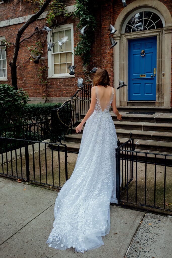 Bộ cuối cùng Aurora mặc đến từ Mira Zwillinger, chiếc váy cưới nằm trong bộ sưu tập mới nhất - Stardust. Váy màu xanh lam nhạt, thân váy được bao phủ bởi rất nhiều ngôi sao sáng lấp lánh, vải ren mảnh nhưng không lộ liễu, mái tóc vàng óng uốn xoăn dài đến eo nhỏ, thanh tao và tinh khiết.