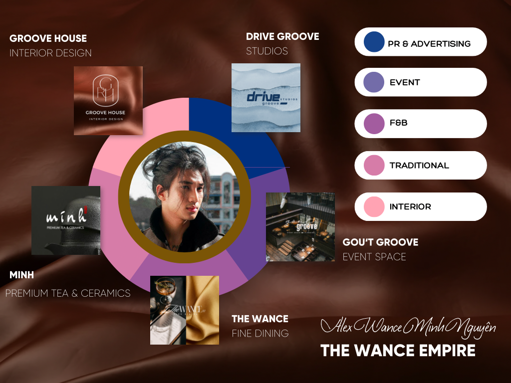 "[...]...GMEC (Groove Me Entertainment Cooporation) là một phân nhánh độc lập trực thuộc tập Gilian Holdings. GMEC hiện được phân thành 4 nhánh chính bao gồm: GME (Groove Me Entertainment) sẽ phụ trách sản xuất, kí kết hợp đồng, đạo tạo talent trong đa mảng giải trí; Drive Groove Studios xử lý hình ảnh, phụ trách sản xuất các ấn phẩm của GME; GoutNet phụ trách mảng truyền hình và hợp tác với báo chí truyền thông truyền thống và truyền hình; hoạt động độc lập về vốn còn có thêm GrooveHouse - thiết kế và phân phối nội thất; Gout Groove - sự kiện và tiệc; The Wance - nhà hàng, Minh - Premium Tea & Ceramics