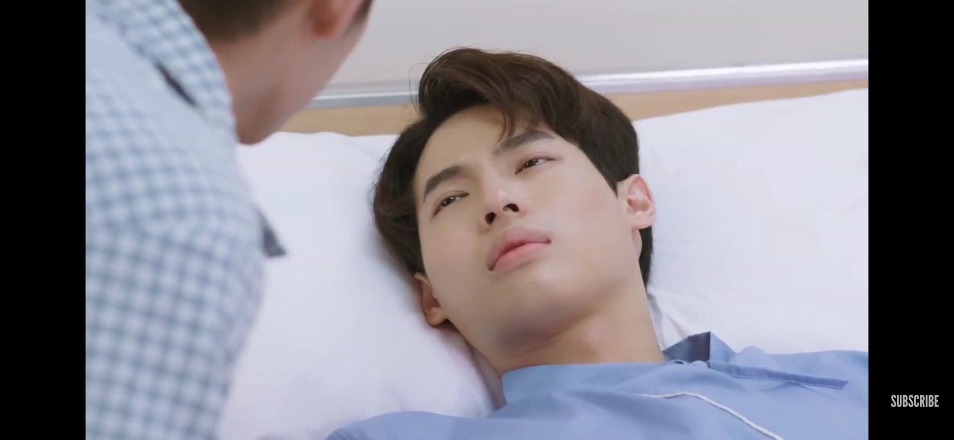 Win từ từ mở mắt ra, mặt nhăn chắc vì đau. Bright mỉm cười cúi mặt xuống nhìn Win an ủi