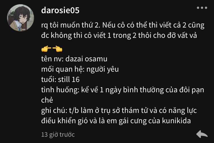 Anh nấu xong mấy bát mì trộn. Mùi thơm liên tục bốc lên bay ra ngoài quyến rũ hai người đang đói ùng ục ngoài kia. Dazai nhìn bạn cười cười, đập tay nhau vì kế hoạch rất chi là thành công. Bạn cùng anh đi vào trong bếp, lại chỉ vào bịch rác, la oai oái: