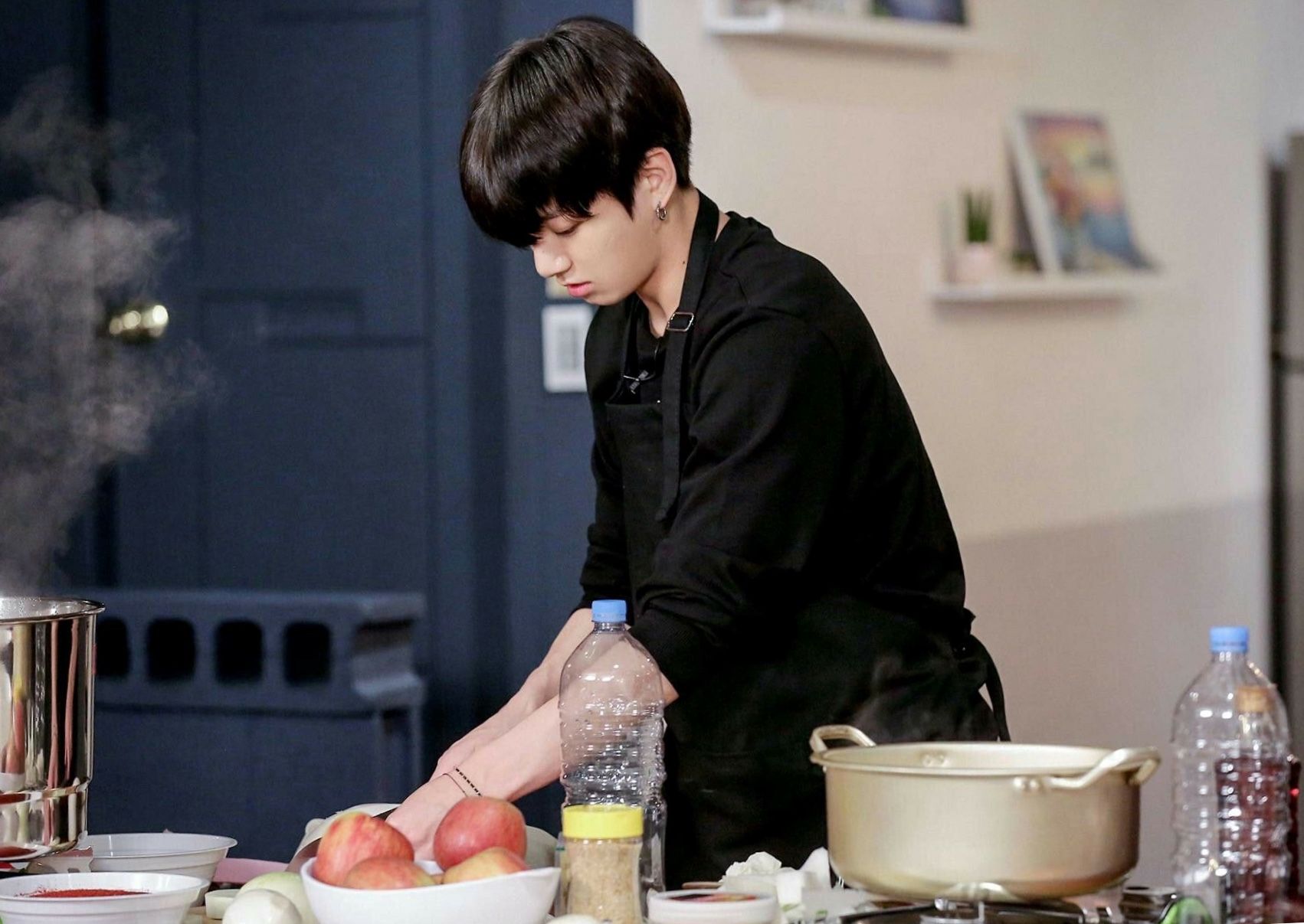 Đang mải ngắm Jungkook nấu ăn thì " Rột... rột... rột..." - "cái tiếng quái quỷ gì thế này, không phải là từ bụng mình phát ra đó chứ! Haizzzz! Thiệt là xấu hổ muốn chui đầu xuống đất quá đi mà! Cũng may là Jungkook không nghe thấy" - Bạn oán trách cái bụng đói của mình.
