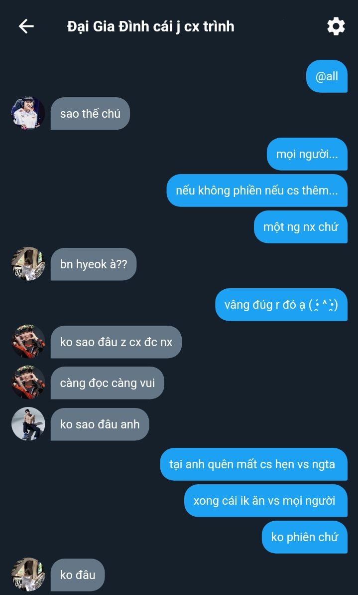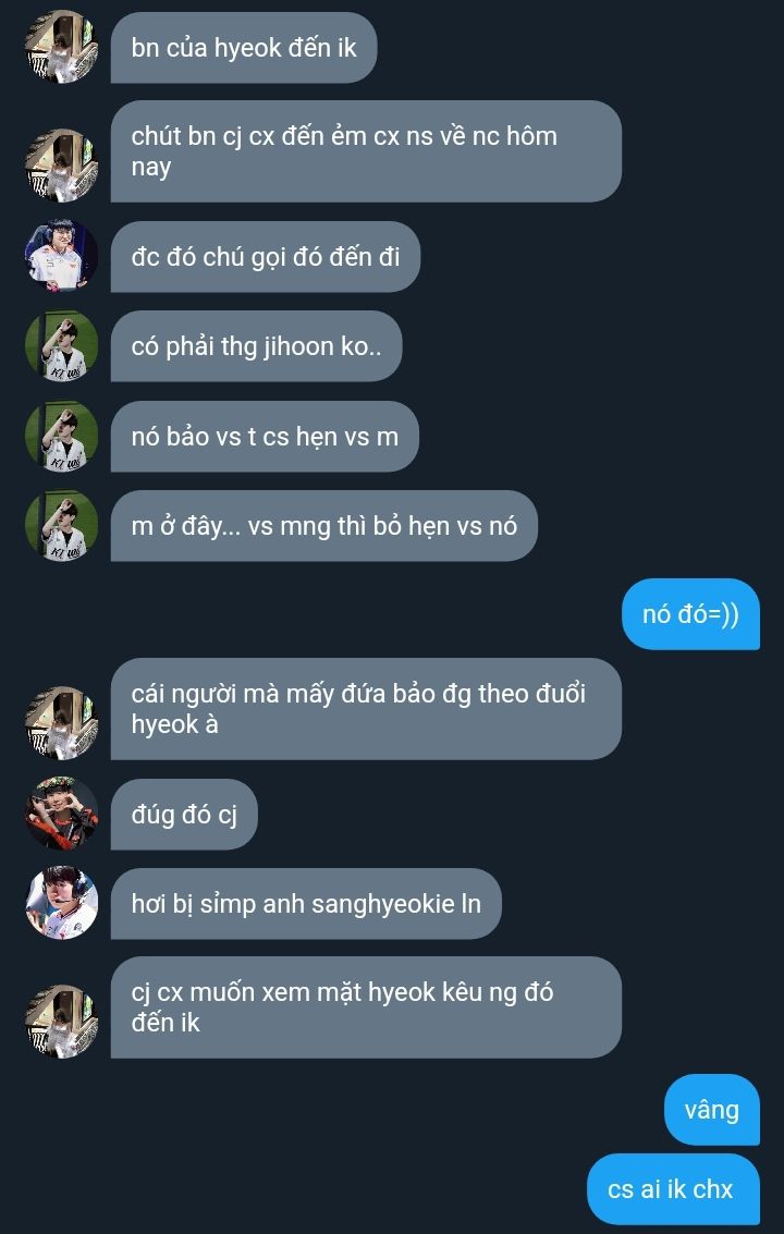 "Ở đây mọi người đa số biết em mà, eunie. Chỉ có... anh dâu... à không, anh Sanghyeok không biết em thôi và vài người em mới gặp." Hyerin ban đầu định nói "anh dâu" liền bị Jihoon trừng mắt một cái, vội đổi lại lời nói, làm Sanghyeok được một phen hoang mang nhẹ. Cô bé lại tươi cười nói tiếp: "Em là em gái của cái người ngồi bên cạnh anh Sanghyeok đó ạ. Anh trai em hơi bị ngốc một chút, có gì anh bỏ qua cho ảnh nhé." Nói rồi, cô bé còn nháy mắt với anh, làm Sanghyeok cũng bật cười.