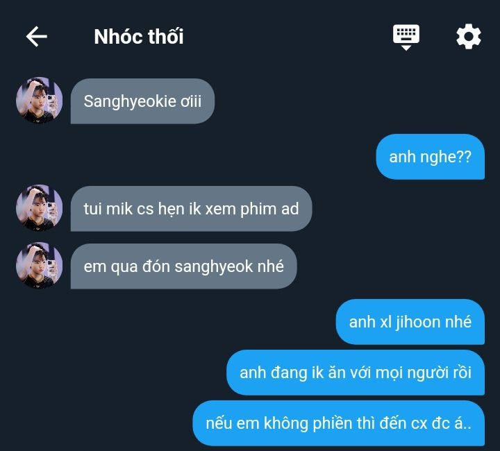 Minhyeong đảo mắt nhìn Hyeonjun rồi lại nhìn thẳng hắn. Cả bàn bỗng nhiên trở nên ngột ngạt. Minhyeong thầm nghĩ: "Lại thêm hai thằng simp lỏ." Mà nó hình như quên mất, nó cũng simp lỏ cún nhỏ của nó. Đang mỗi người một suy nghĩ thì Lee Haeun lên tiếng, phá tan bầu không khí khó xử.