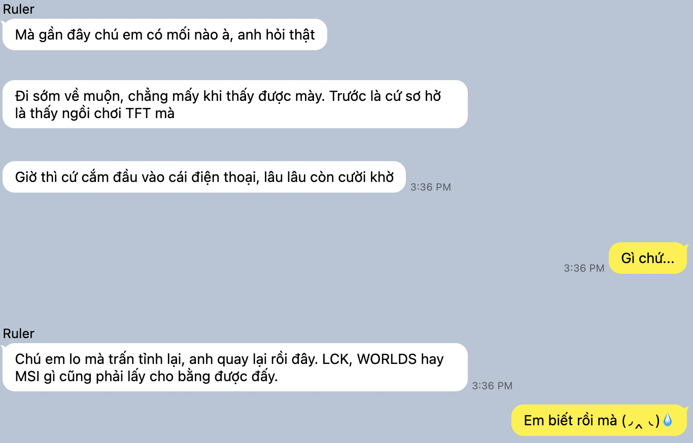 Vốn định từ chối nhưng một phần vì đã hứa với Minseok về chuyện giả làm người yêu, phần còn lại với tư cách là một midlaner trò chuyện cùng Sanghyeok cũng như một cách lĩnh hội kĩ năng và kiến thức mới trong dịp off season này. Dù sao anh cũng là midlaner vĩ đại nhất của cái tựa game này mà.
