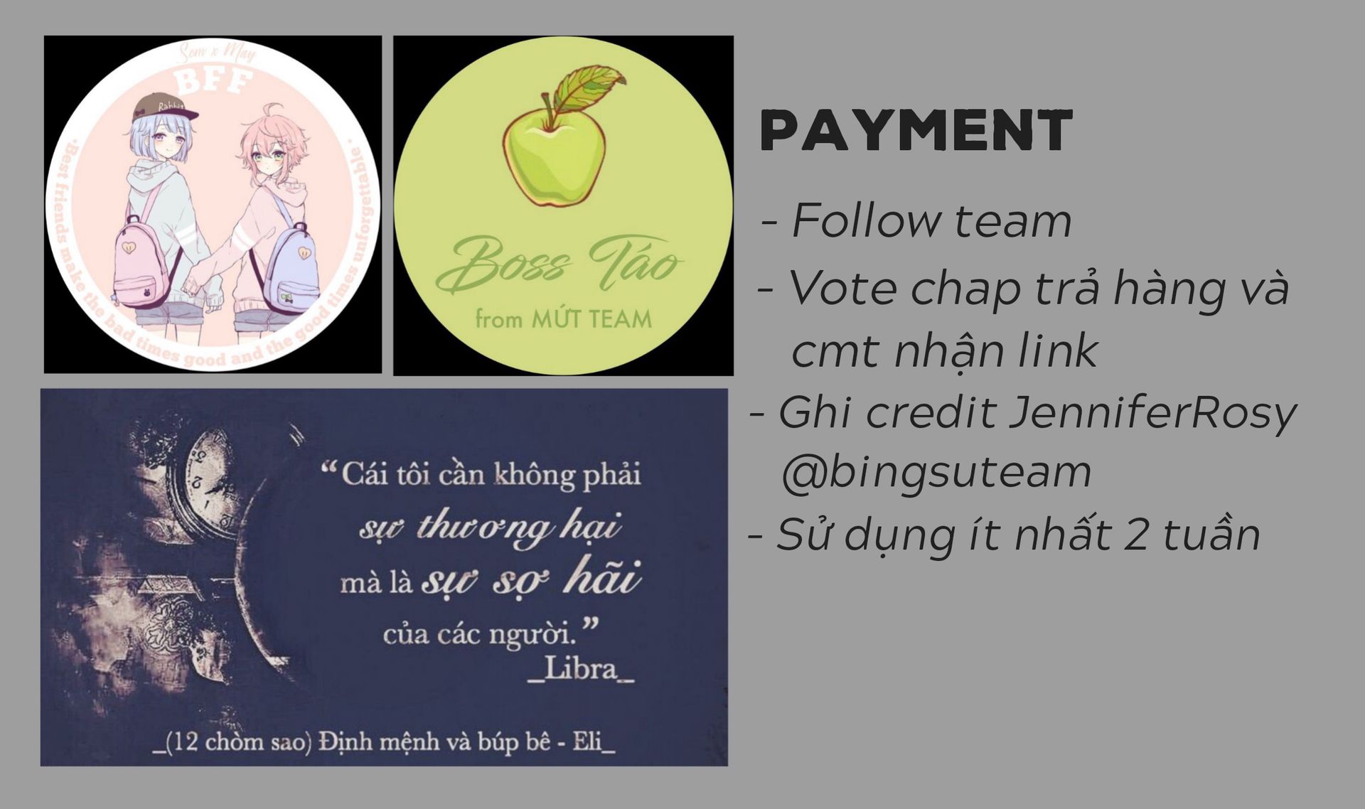 (Lưu ý: ghi rõ thể loại các cậu muốn đặt ở đầu đơn. Ví dụ đặt bookcover thì ghi "bookcover" ở đầu comment).