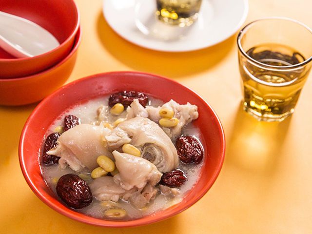 Canh giò heo đã được hầm hơn một canh giờ, nước canh đã chuyển màu trắng, bên trong bỏ táo đỏ, kỷ tử, bồi bổ khí huyết.