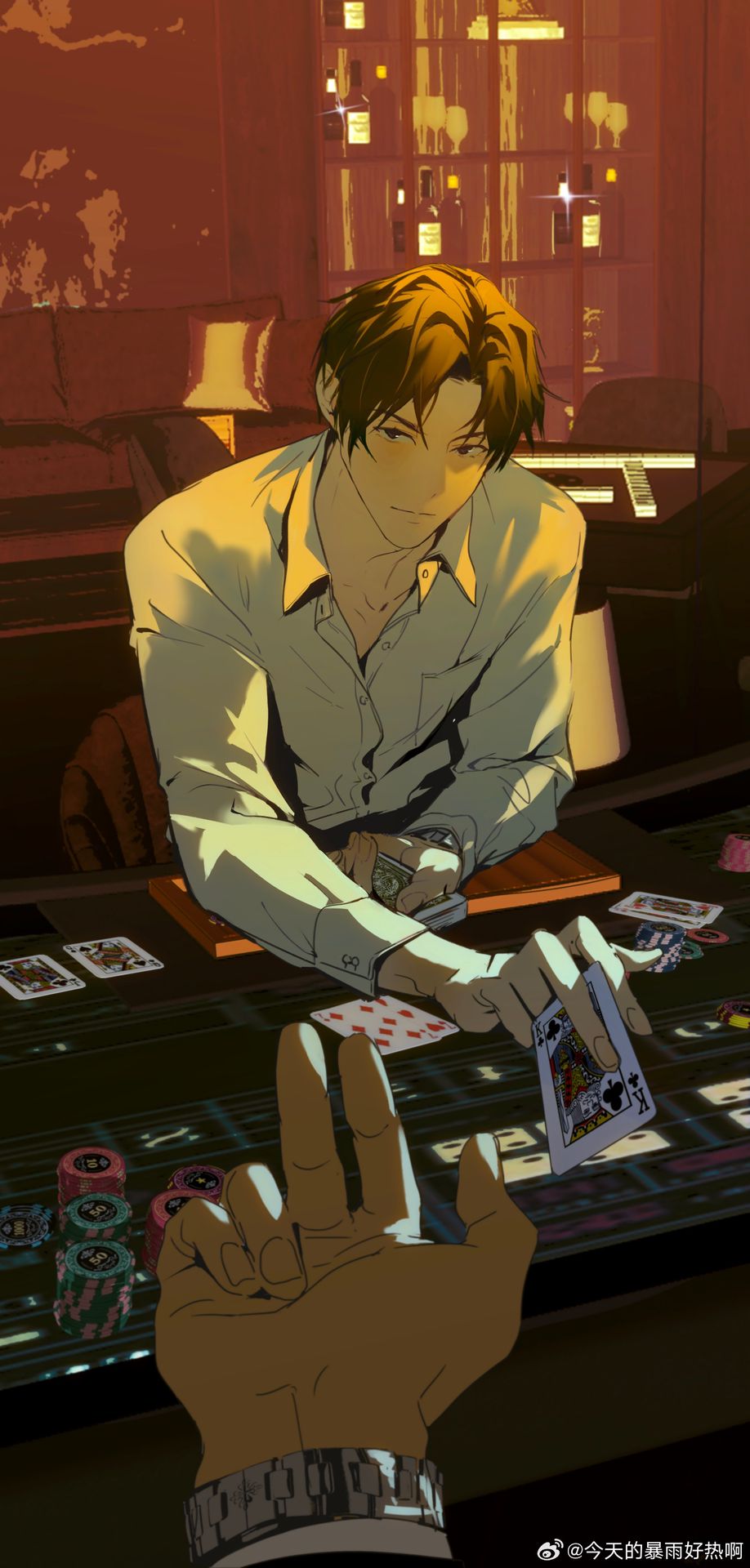 Ngay cả khi làm một việc tiêu khiển thuần túy như xào bài, chia bài, Trần Vãn cũng rất nghiêm túc, chiếu bạc được đặt trên boong tàu ngoài trời, hoàng hôn đỏ rực phủ xuống mặt biển, rọi lên người cậu, đẹp đến mức khiến người ta không thể rời mắt.