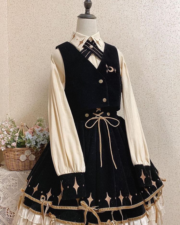 Bộ váy Nguyệt mặc mang tông đen be nhạt, điểm chút họa tiết trang trí màu vàng gold tinh tế khiến cô trông cứ như một vị tiểu thư nào đó vậy.