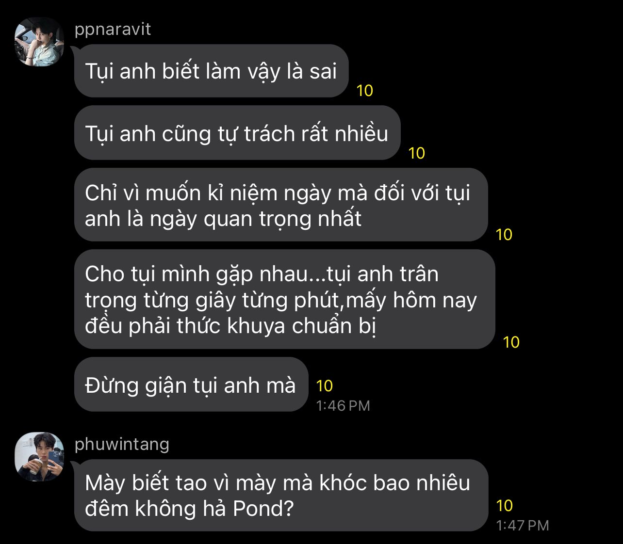->chen_rcj: mốt t khóc m ôm t m dỗ zống z nha... t cũng muốn...Pond ôm ôm