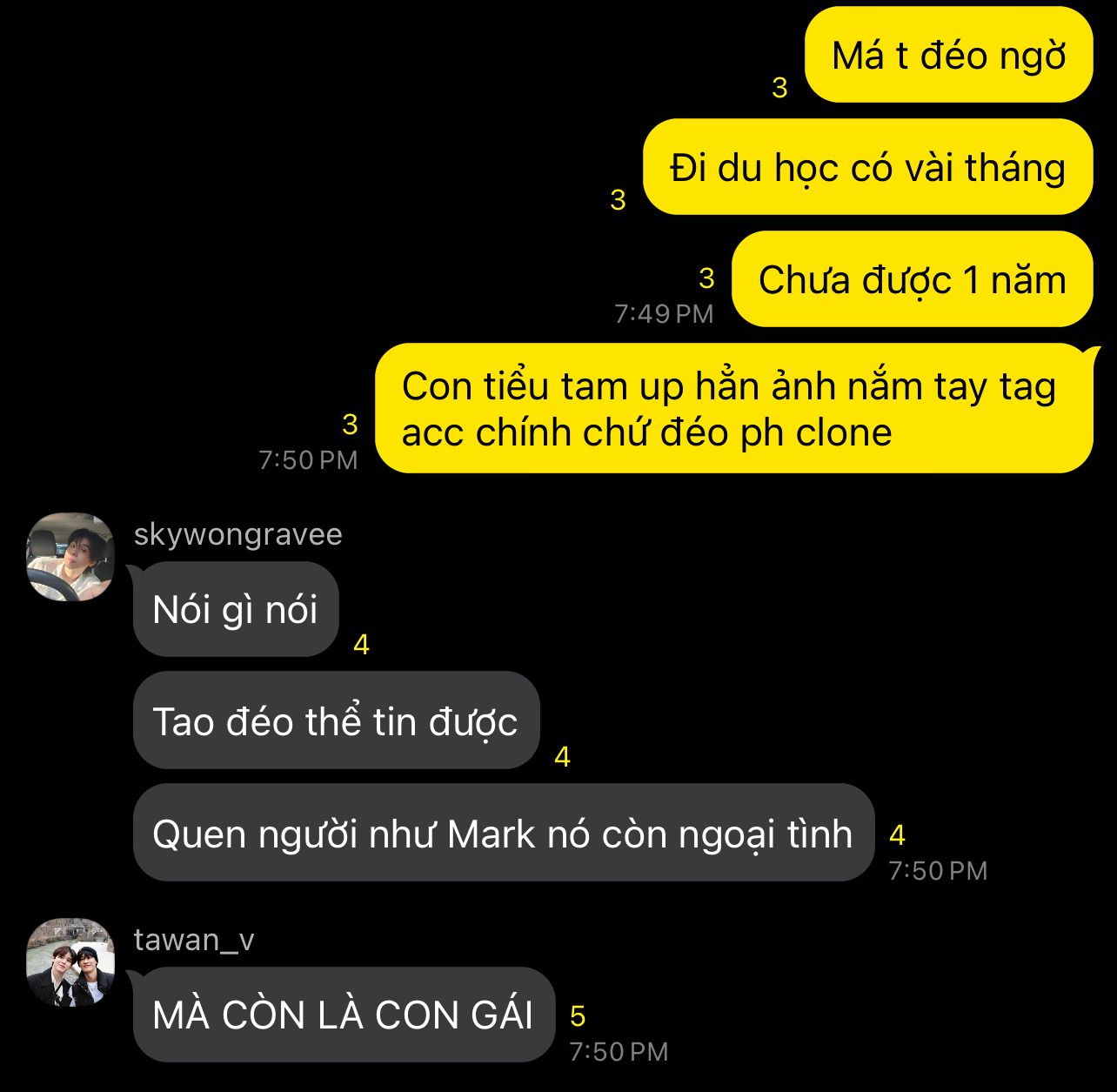 Ok,bọn tao không đồng tình và cực kì ghét việc ngoại tình,bọn tao chơi cùng nhau và yêu nhau,cặp yêu nhau lâu nhất cũng có tên của thằng Ju và thằng Mark trong đó,ít nhiều gì tao cũng đoán được thg Ju vì cảm giác trống trãi mới như vậy với mày,cho nên đừng vội mừng,điều ngu ngốc nhất là mày tin mày sẽ thắng Mark Jiruntanin.