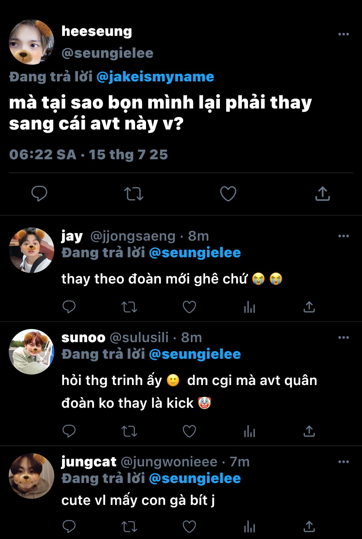 "gì đây? cái bầu không khí này là sao vậy?" kim ngây thơ lên tiếng sau khi thấy heeseung và jaeyun, mắt đảo qua lại giữa 2 người.