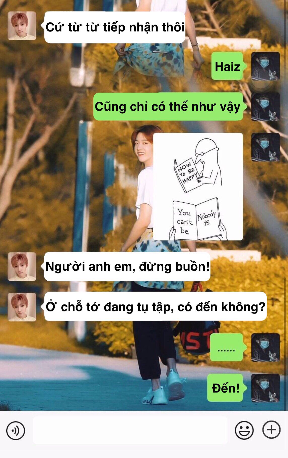 "Hả, dạ? Không có gì hahaha, chỉ là tuỳ ý đọc cuốn tiểu thuyết."
