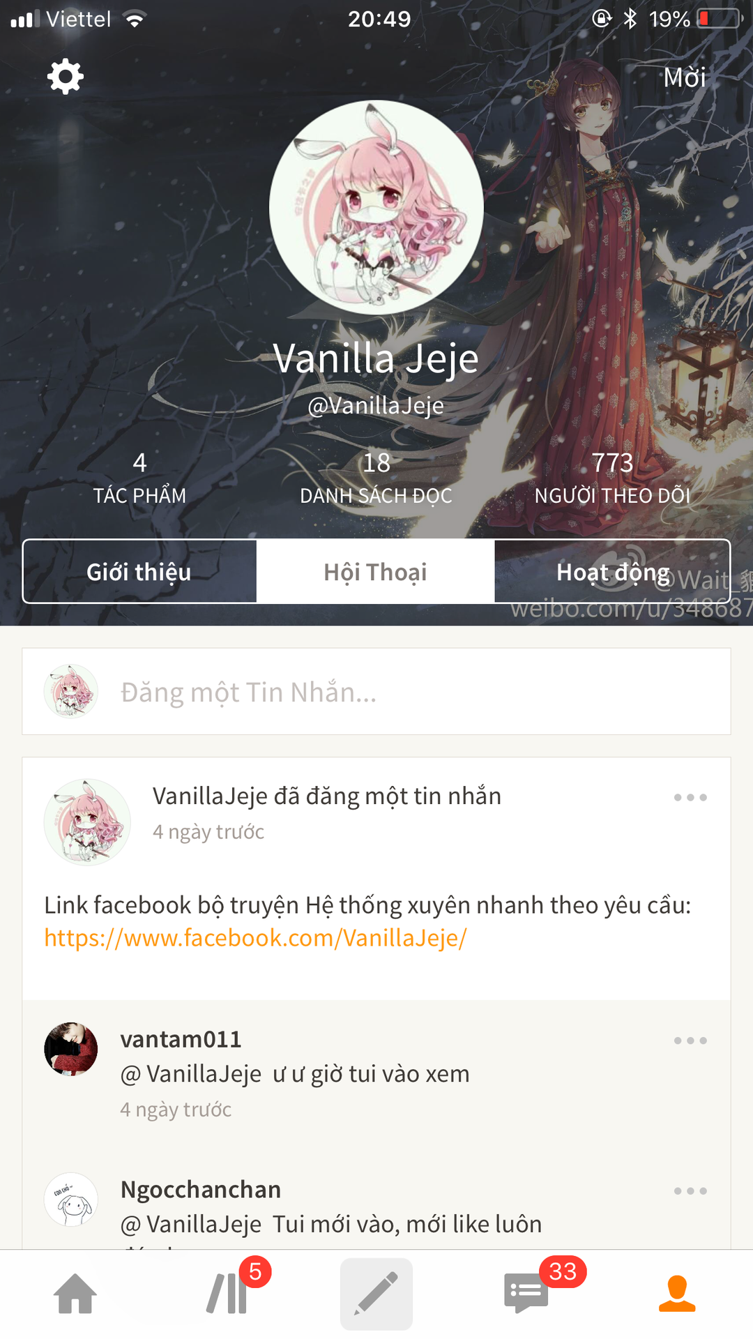 *LƯU Ý: Ta nói page là page facebook chứ không phải cái hồ sơ tác giả của ta!!! Mọi người phải bấm vào link chuyển đến facebook follow chứ chỉ follow ta cũng như không thôi!!!