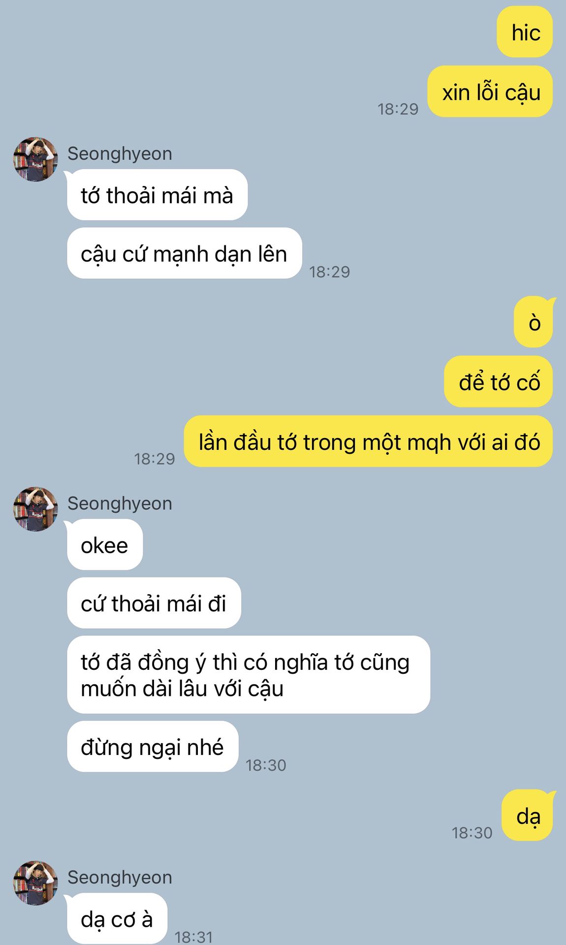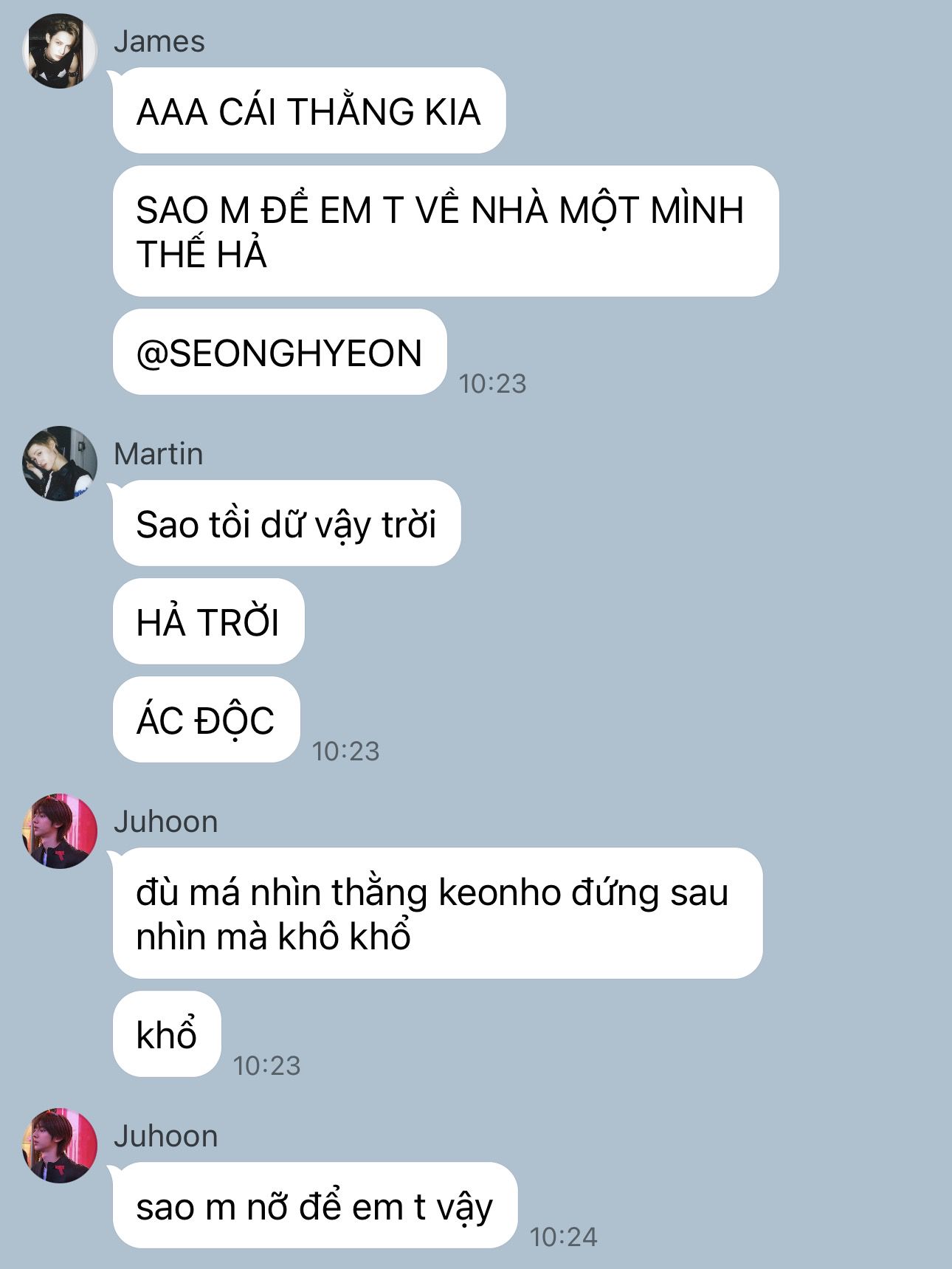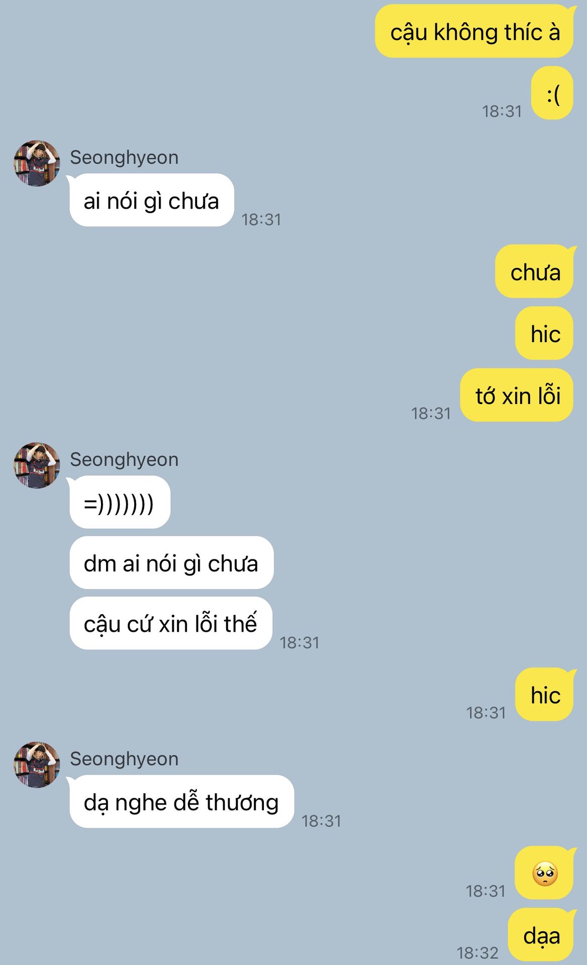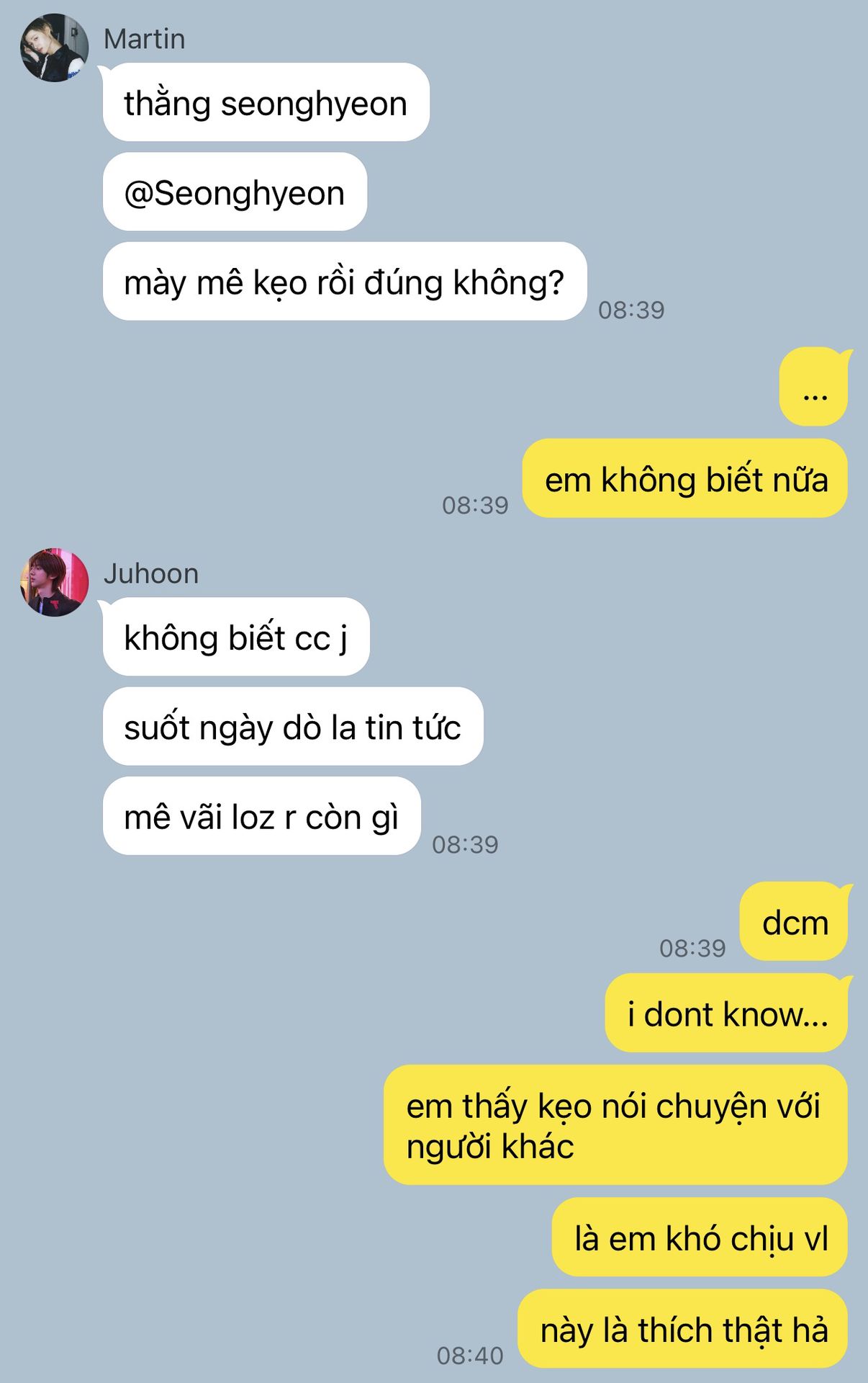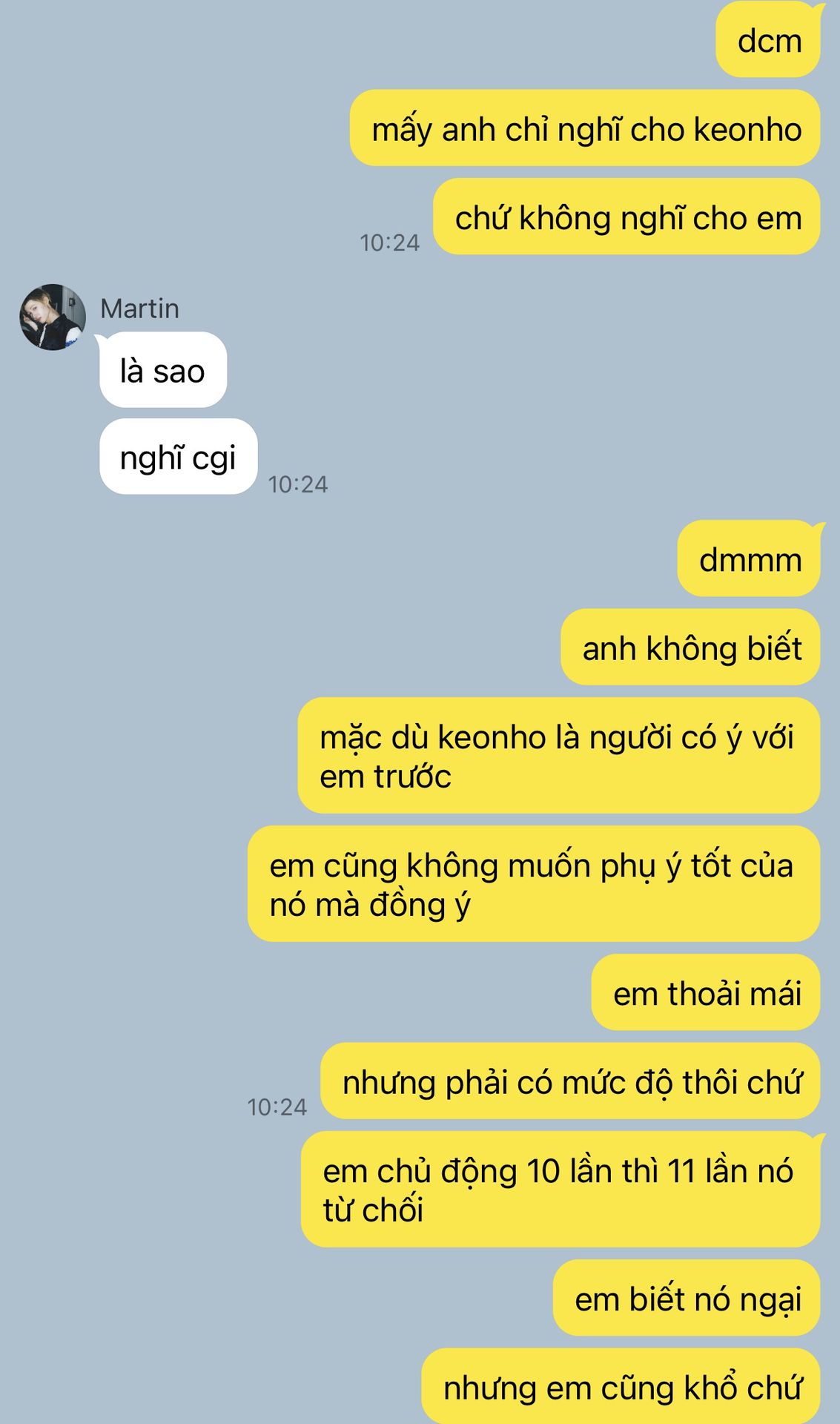 "Ờ, nói dừng xong ngày lờ nào cũng nhắn hỏi tao về thằng Keonho nè. Cái gì mà dạo này bạn ấy có hỏi thăm em không? Có nói gì về em không bla bla. Đã vậy mỗi khi nhóm đi chung là nó cứ lén nhìn thằng nhỏ. Má hahahaha."