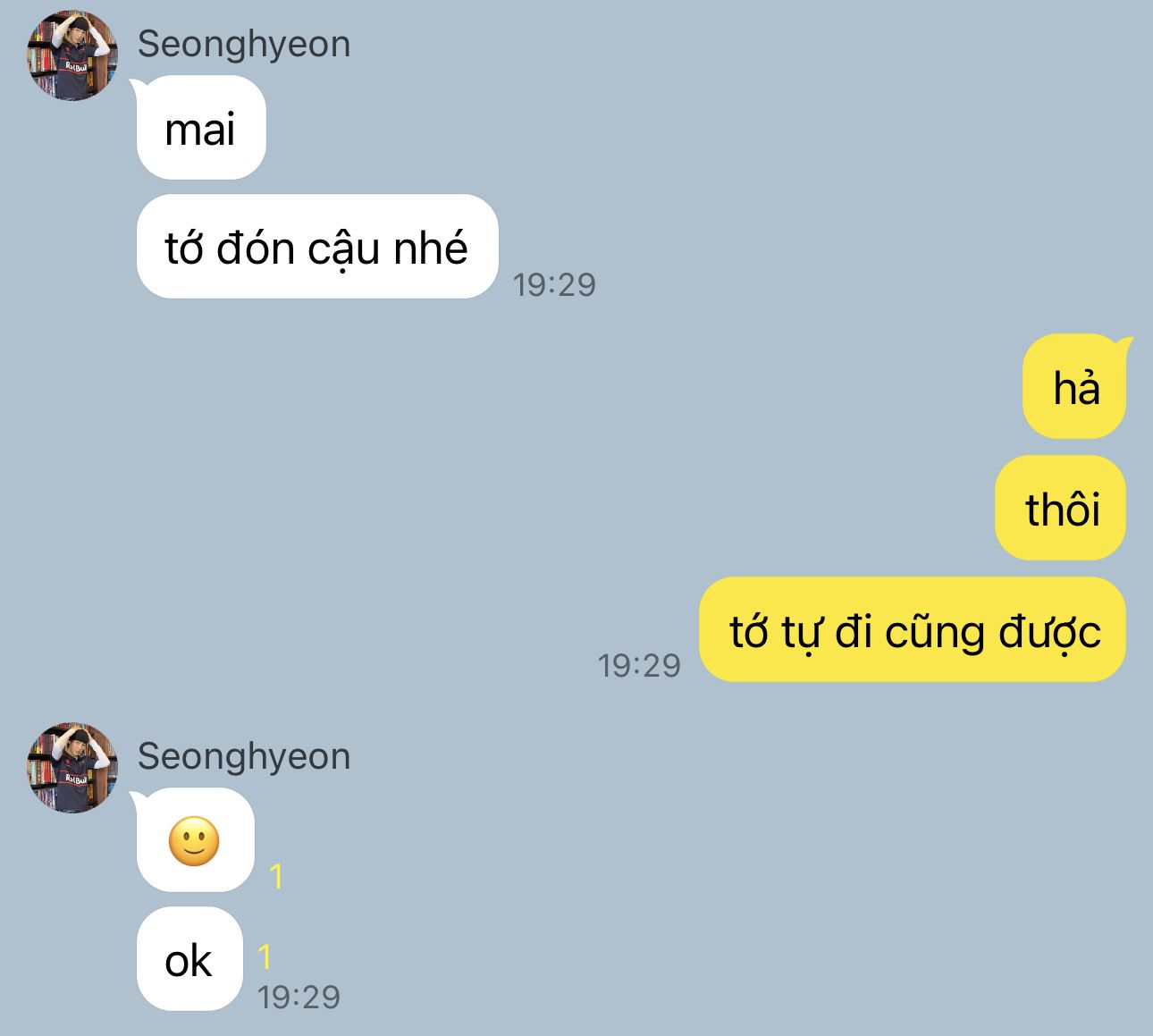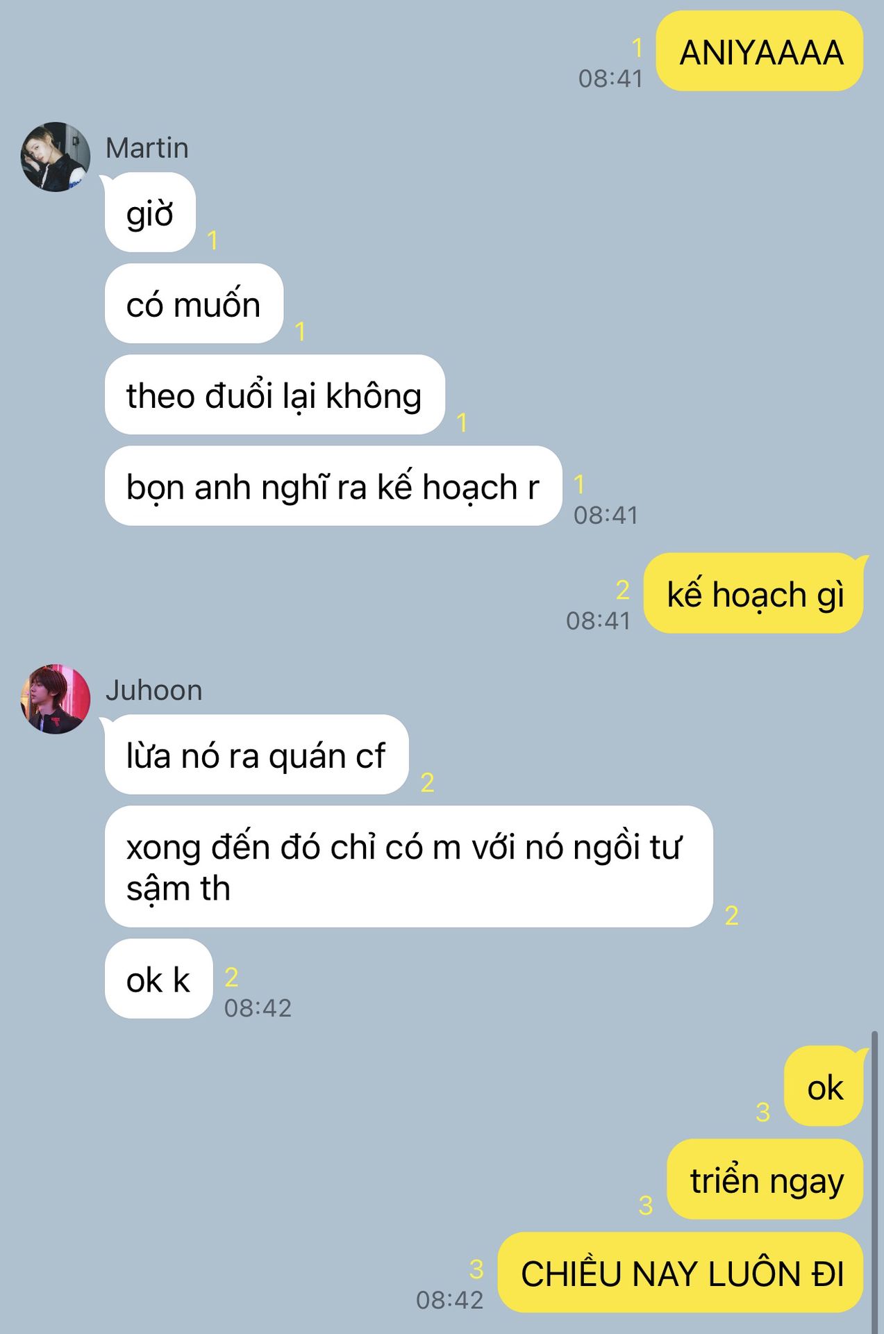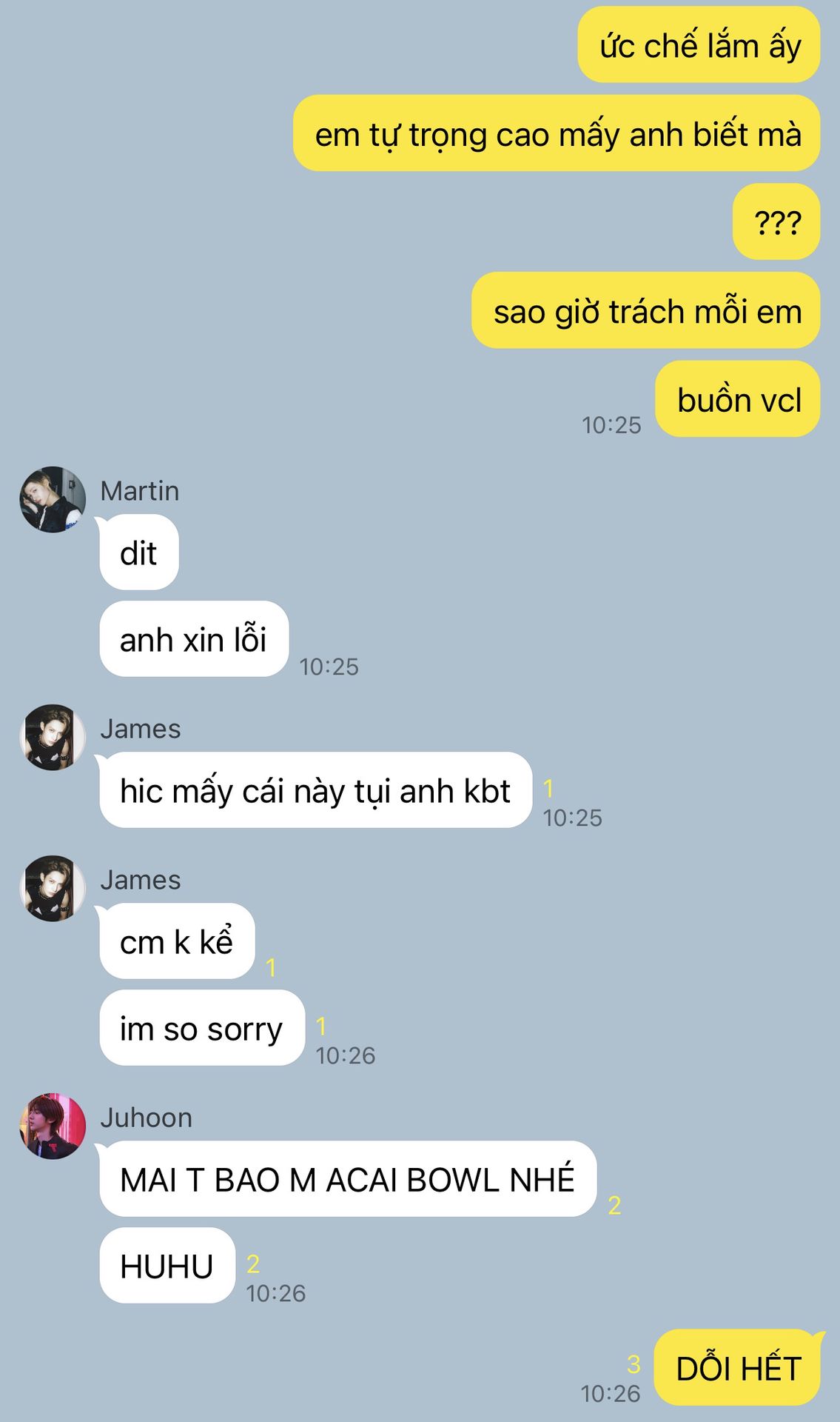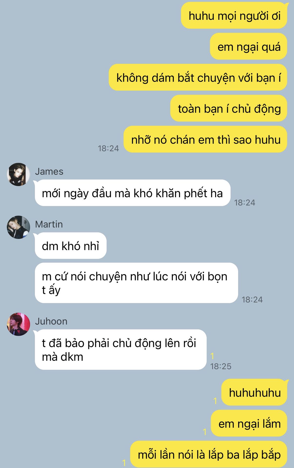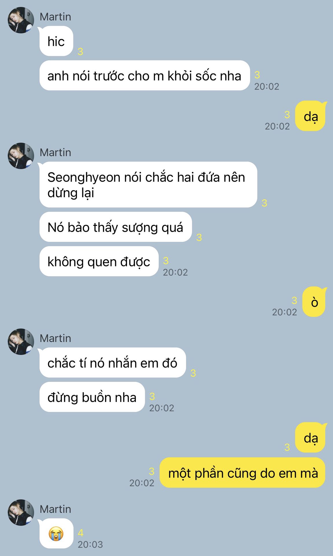 "Ờ, nói dừng xong ngày lờ nào cũng nhắn hỏi tao về thằng Keonho nè. Cái gì mà dạo này bạn ấy có hỏi thăm em không? Có nói gì về em không bla bla. Đã vậy mỗi khi nhóm đi chung là nó cứ lén nhìn thằng nhỏ. Má hahahaha."