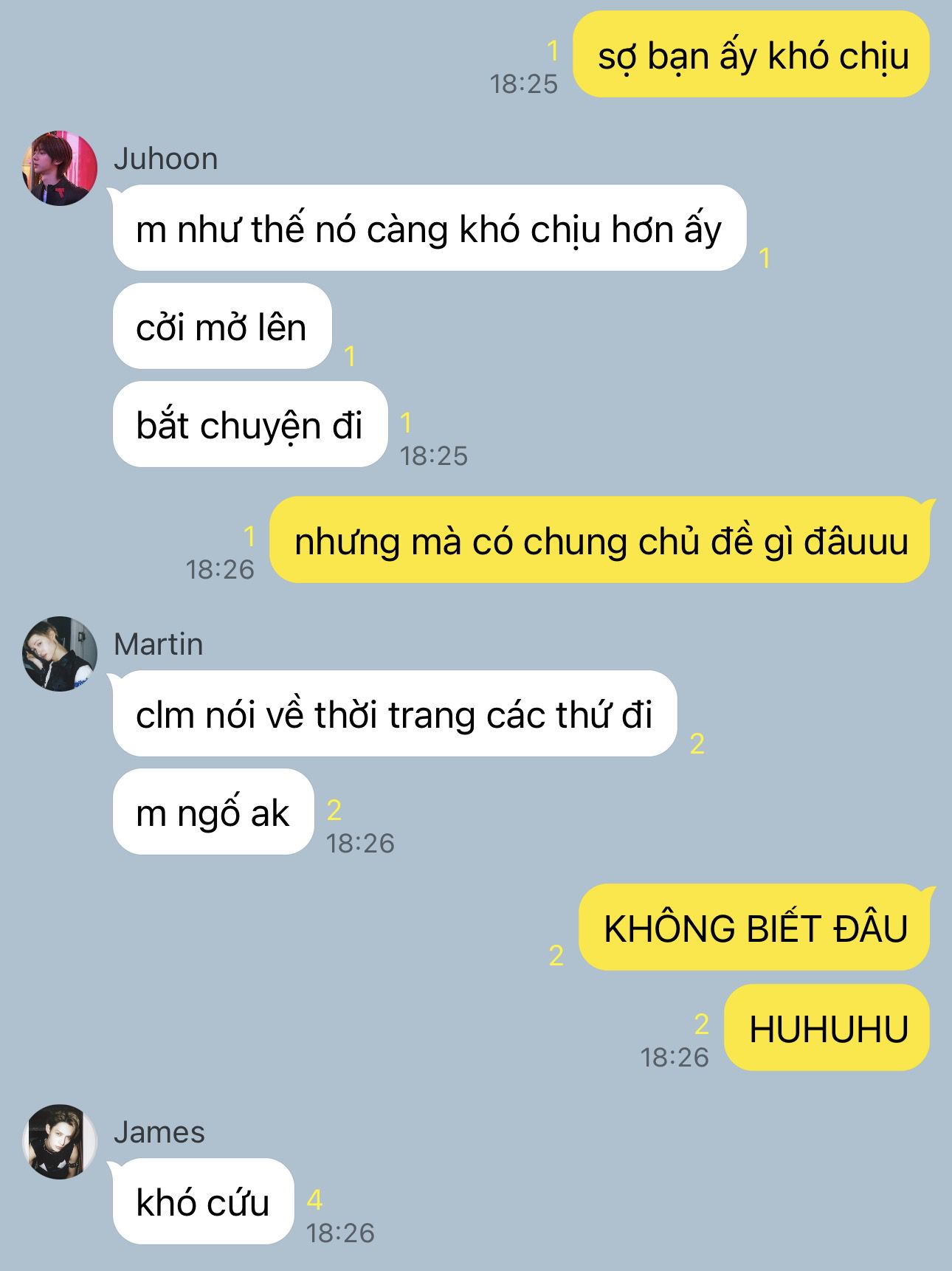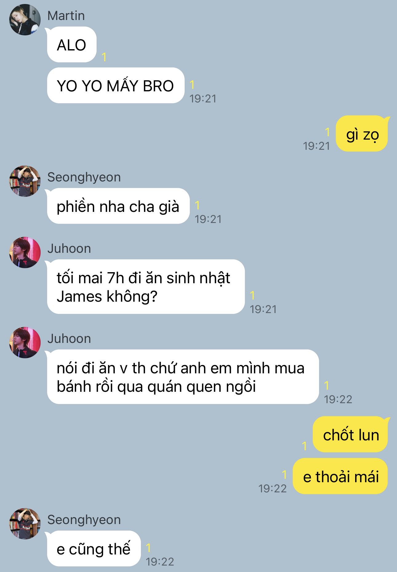 Tối hôm đó, lúc Keonho đang ngồi loay hoay làm toán thì tiếng thông báo tin nhắn chợt kêu. Martin vừa tạo group riêng không có James để rủ mọi người đi ăn sinh nhật anh.