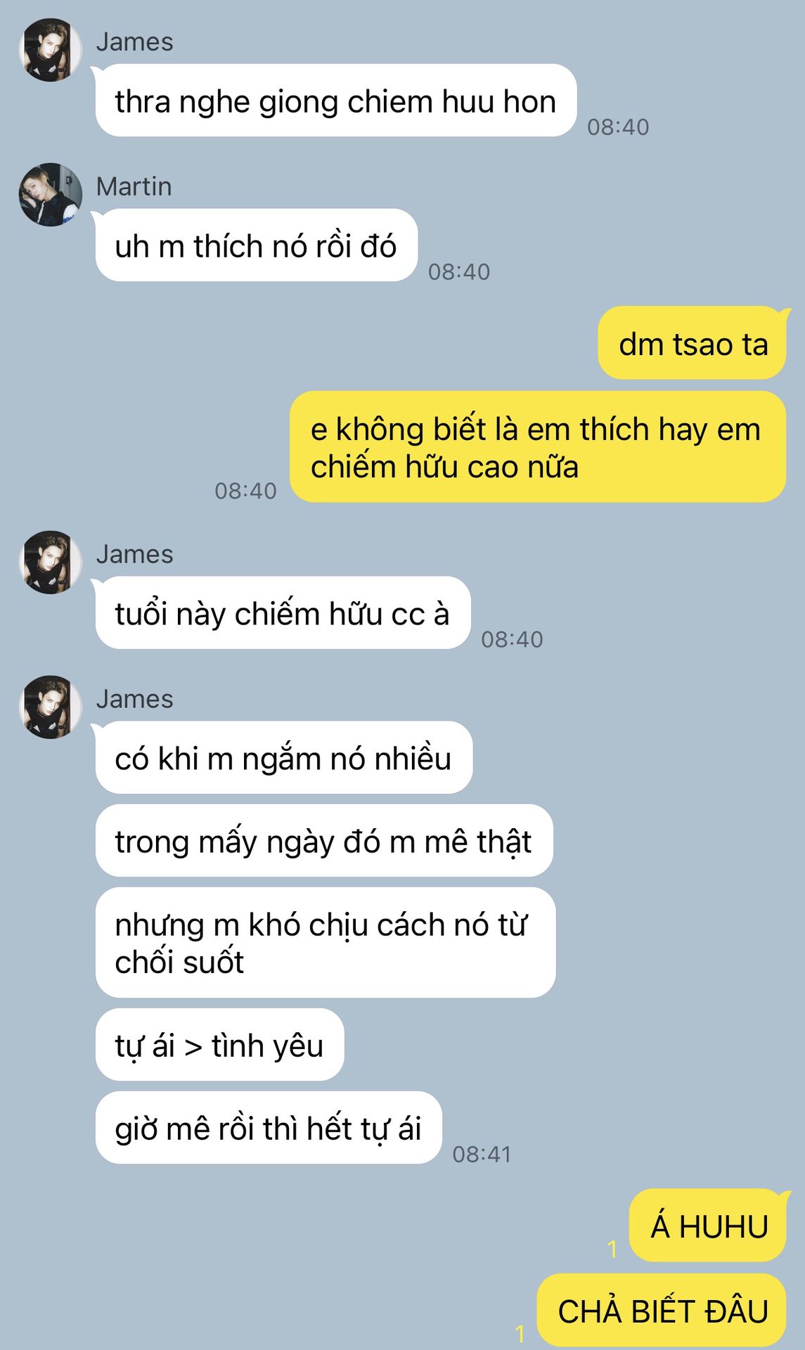 "Đù má giật mình nha bro!" Martin giật nảy mình trước sự xuất hiện của thằng em.