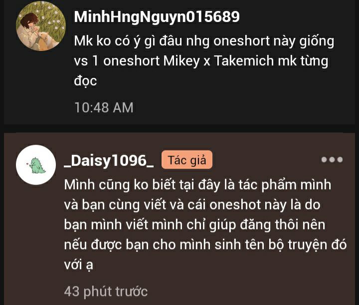Mình sẽ xóa oneshot1 và 2 do có một bạn đã nói với mình 2 oneshot đó rất giống truyện của một tác giả viết về cp Mikey và Takemichi trong một bộ truyện anime nhật bản.Mình ít xem anime nên mình ko có biết cp này mong mọi người thông cảm.Và mình đã đọc bộ truyện về cp Mikey và Takemichi của tác giả đó mình sẽ ko nhắc tên để ko ảnh hưởng đến cả đôi bênh và đúng là nó rất giống,giống đến 80 90%.