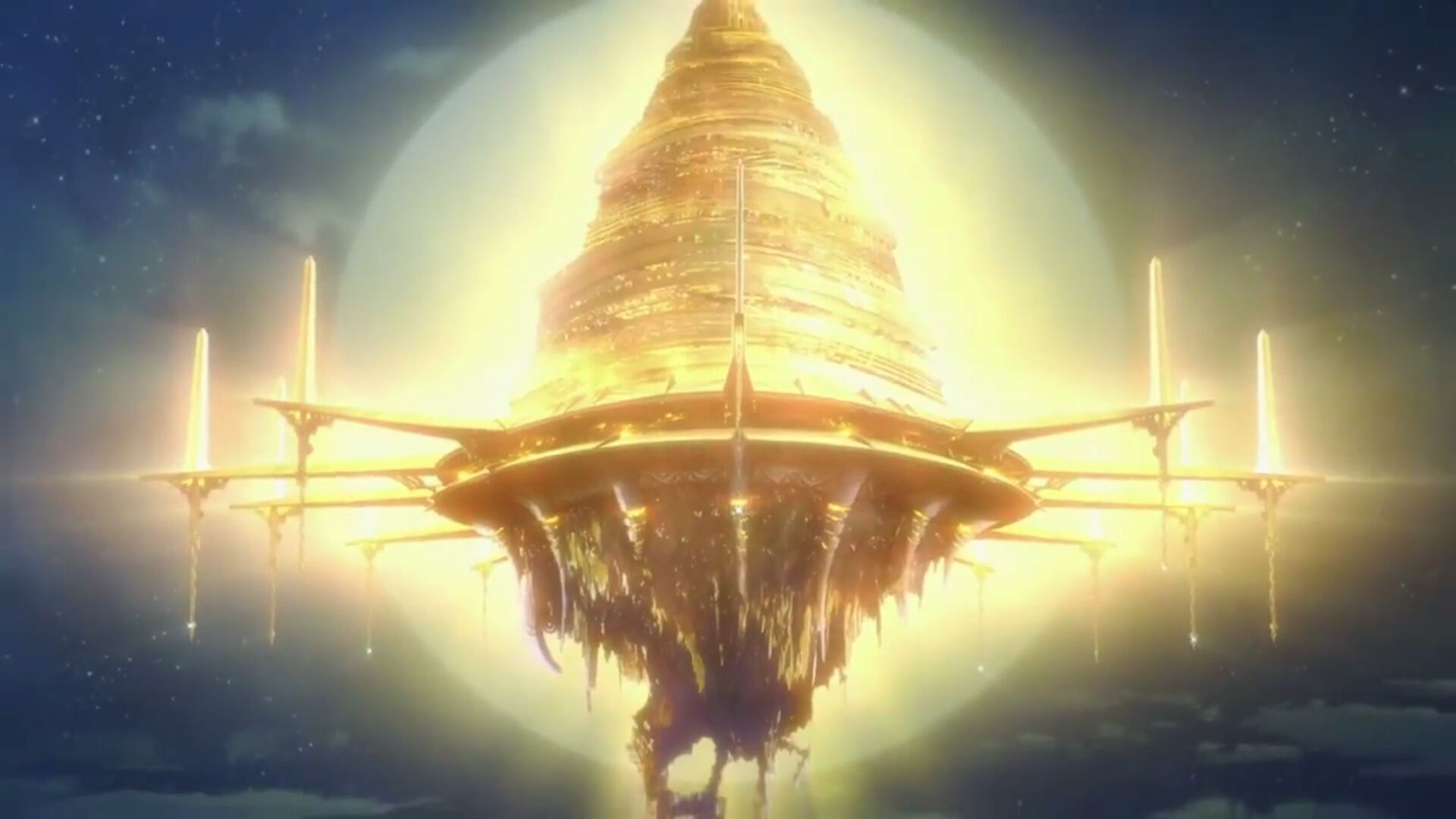 Một cái Dungeon trôi nổi trên bầu trời và toản ra ánh sáng vàng kim