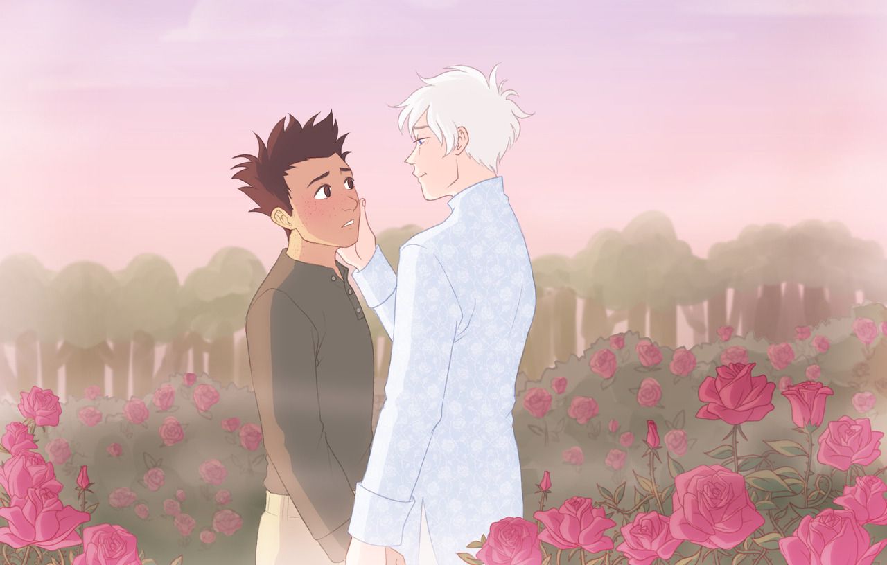Khu vườn hiện ra dưới những ngón tay của Gon, nở ra những màu phấn nhẹ nhàng. Killua đi theo chúng, chiếc áo dài màu xanh hoa ngô rực rỡ, đôi mắt mở to và sáng như bầu trời phía sau, đôi môi hồng như cánh hoa và hơi hé mở, như thể anh ấy định gọi ai đó. Mơ mộng hão huyền, Gon rầu rĩ tự nhủ, rồi tự hỏi mình bị làm sao vậy. Cậu mới biết Killua chưa đầy một tuần, họ mới là bạn chưa đầy một ngày, làm sao cậu có thể nghĩ bất cứ điều gì mơ mộng về anh ấy?