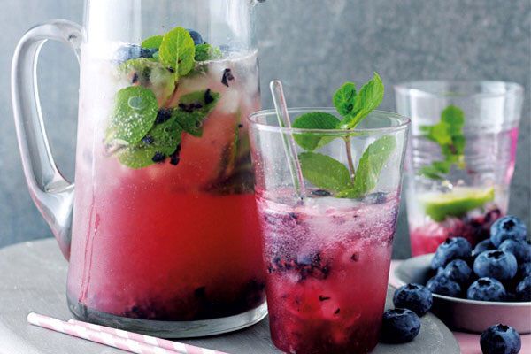Mojito Việt quất: Mojito Mint syrup, Blueberry syrup hoặc quả việt quất tươi (tùy chọn), chanh tươi, đường cát trắng và soda.