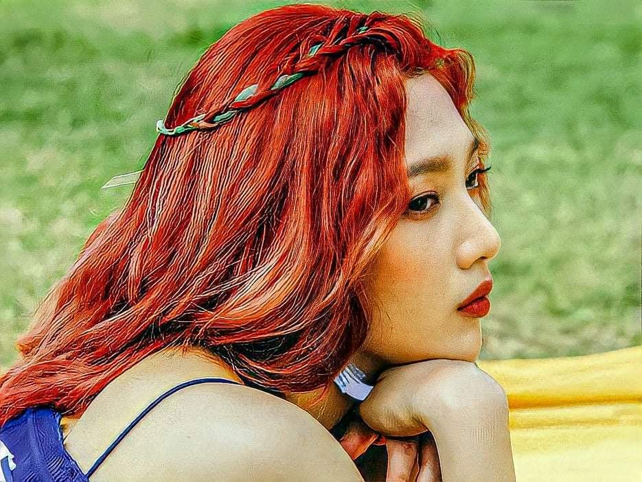 Miêu tả; Tóc dài xoăn lọn màu đỏ cam, mắt màu nâu đậm.