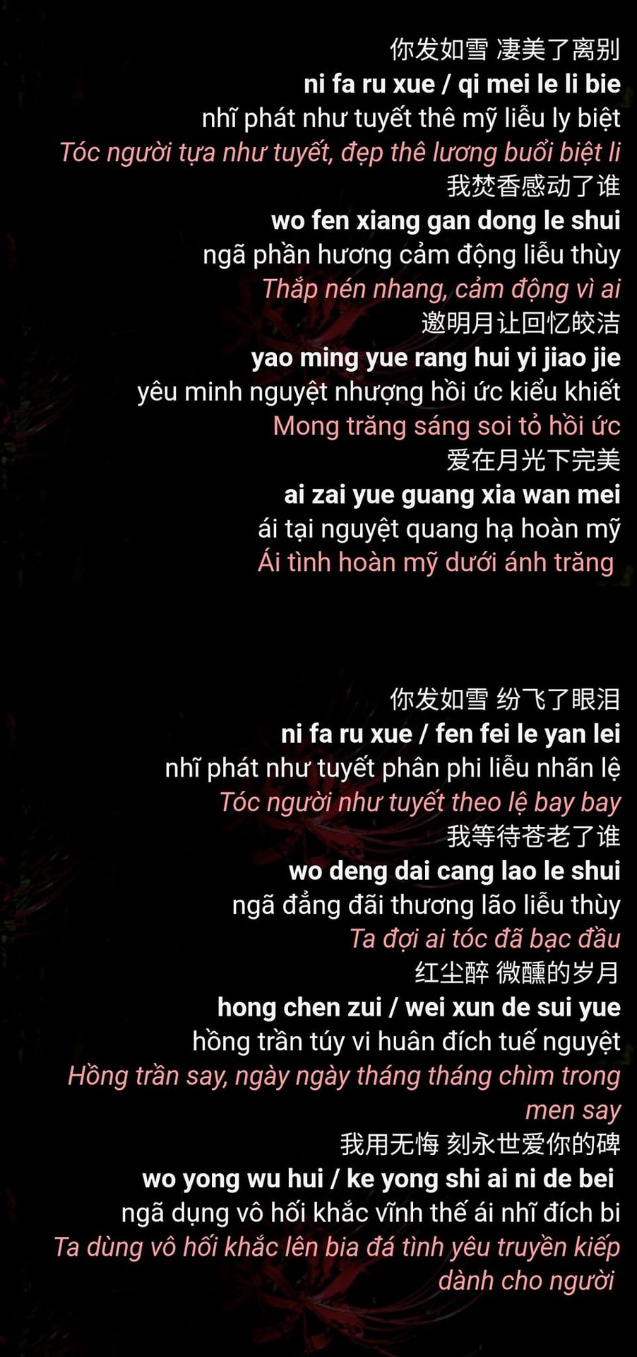 (1) Lời bài hát được chuyển ngữ dựa trên "Tóc Như Tuyết" của Châu Kiệt Luân, có tham khảo bản dịch của: https://sakurared.blogspot.com/2013/01/toc-nhu-tuyet-fa-ru-xue-hair-like-snow.html?