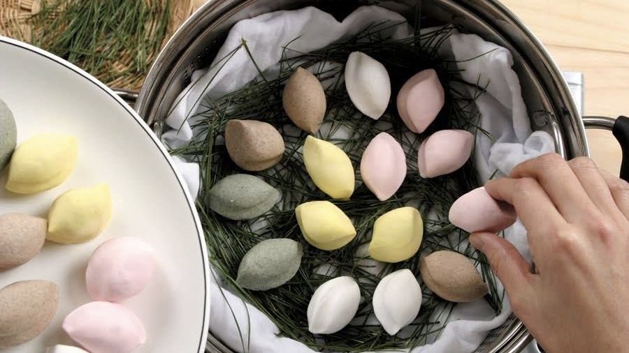 mẹ lý cầm trên tay miếng bánh gạo không rõ hình thù, nhăn chỗ này lõm chỗ kia.