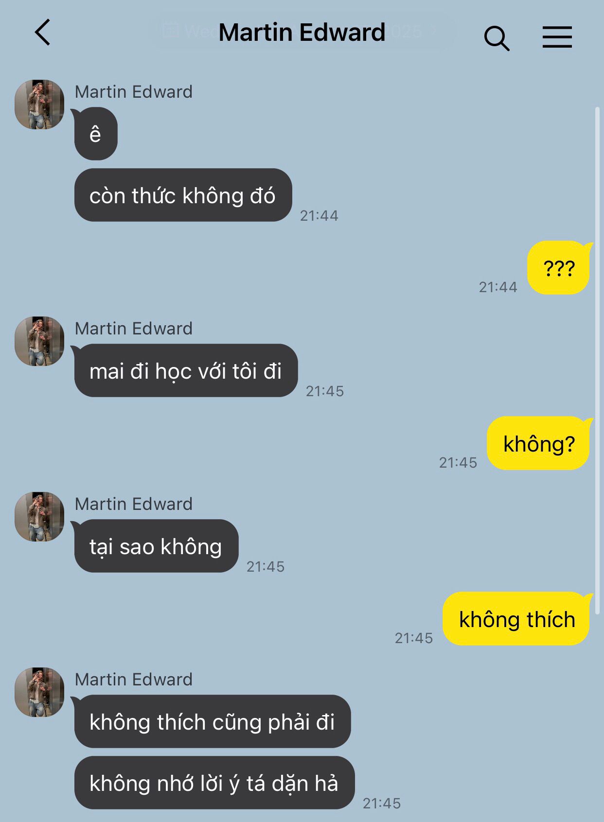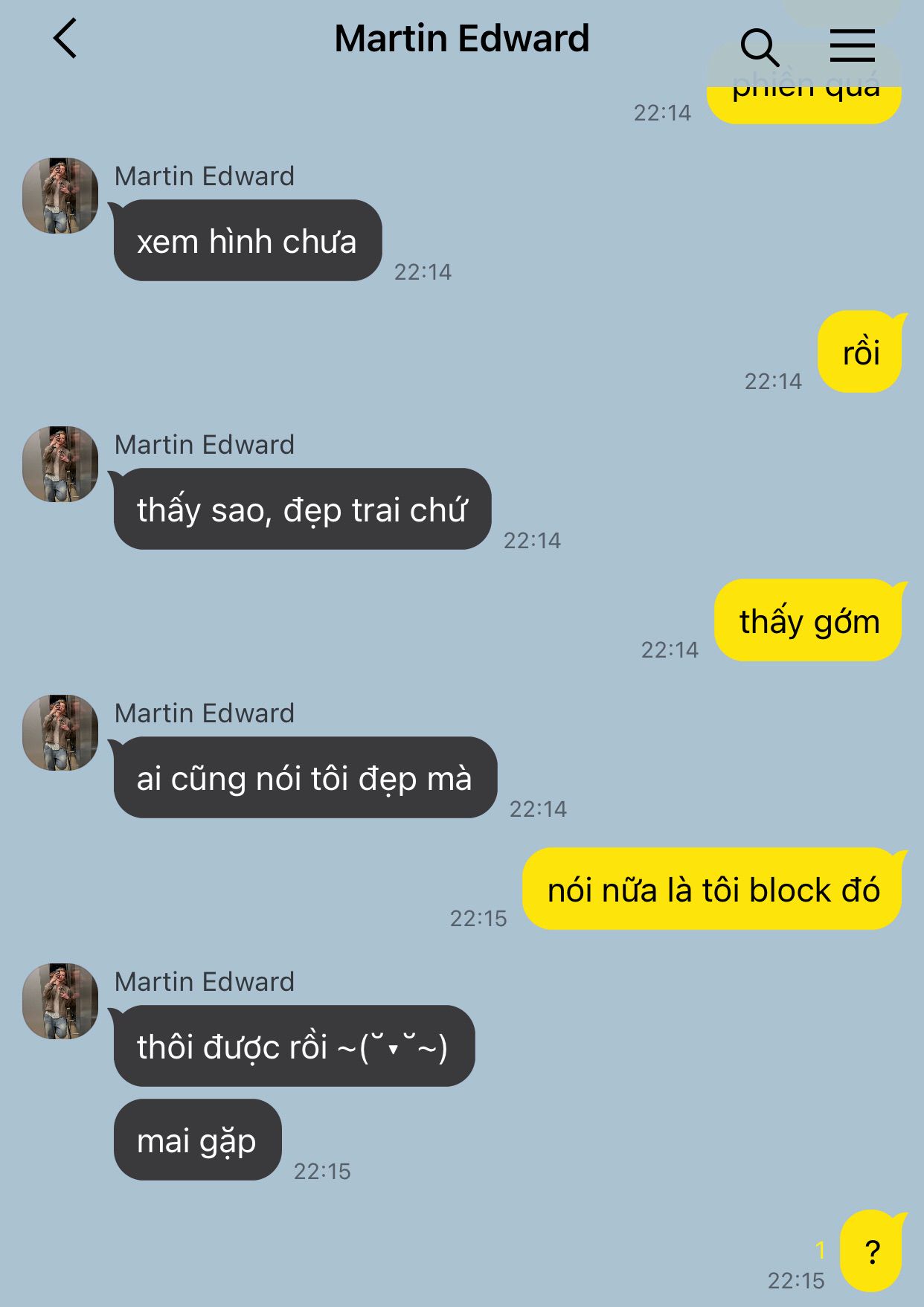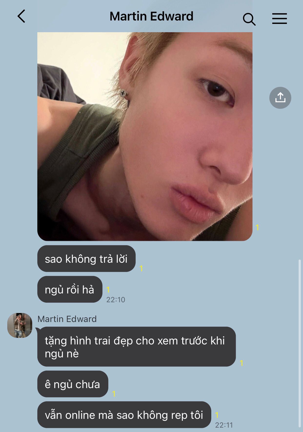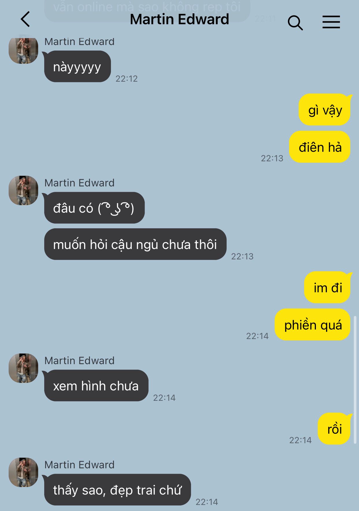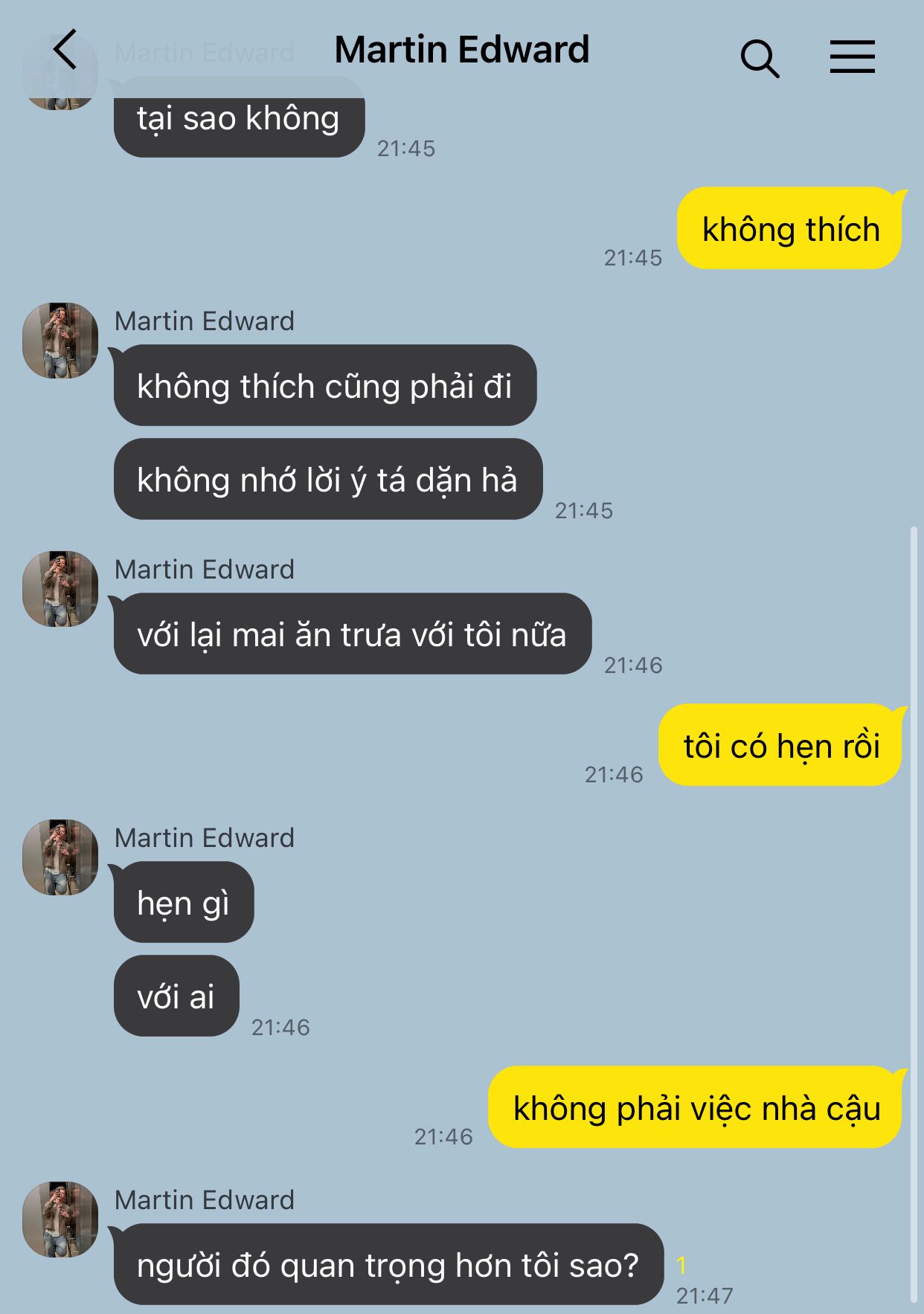Cậu thở dài một hơi. Chưa kịp đặt điện thoại xuống, tin nhắn khác lại đến. Không ai khác là Martin, cái người làm cậu giận lúc chiều.