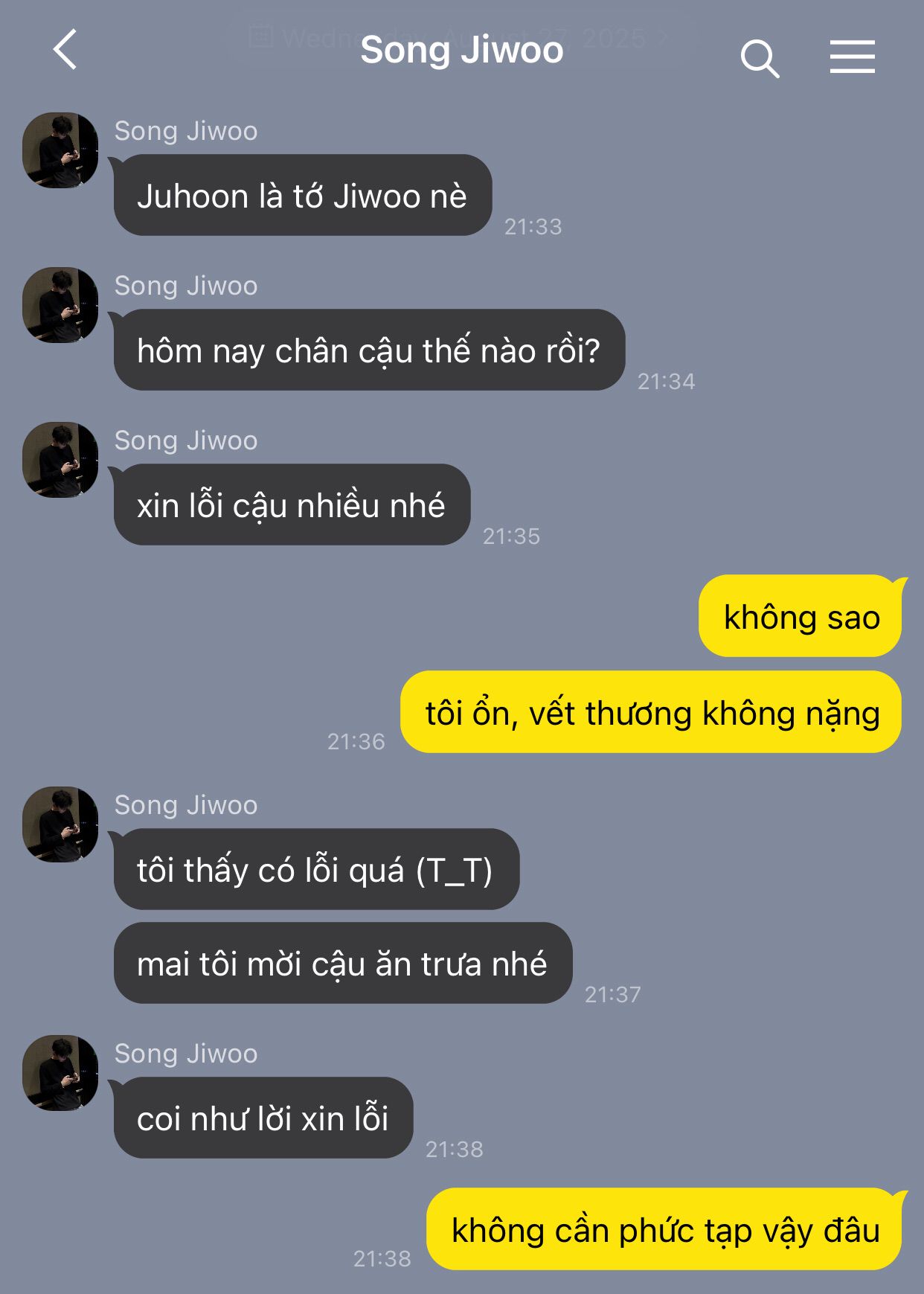 Tiết học cuối cùng kết thúc. Giờ ra về ồn ào tiếng học sinh cười nói vang vọng khắp sân trường. Juhoon khoác ba lô, khẽ nhăn mặt khi đứng dậy, chân đau nhói nhẹ khi bước ra khỏi lớp. Bước nhẹ từng bước xuống cầu thang.