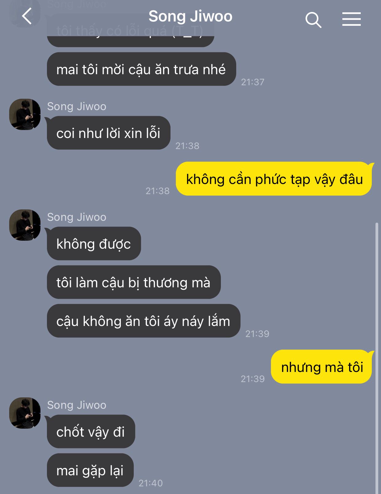 -Juhoon nhún vai: "Càng lớn càng cần được nuông chiều đó nha." cậu vừa gắp đồ ăn vào bát bố vừa nói.