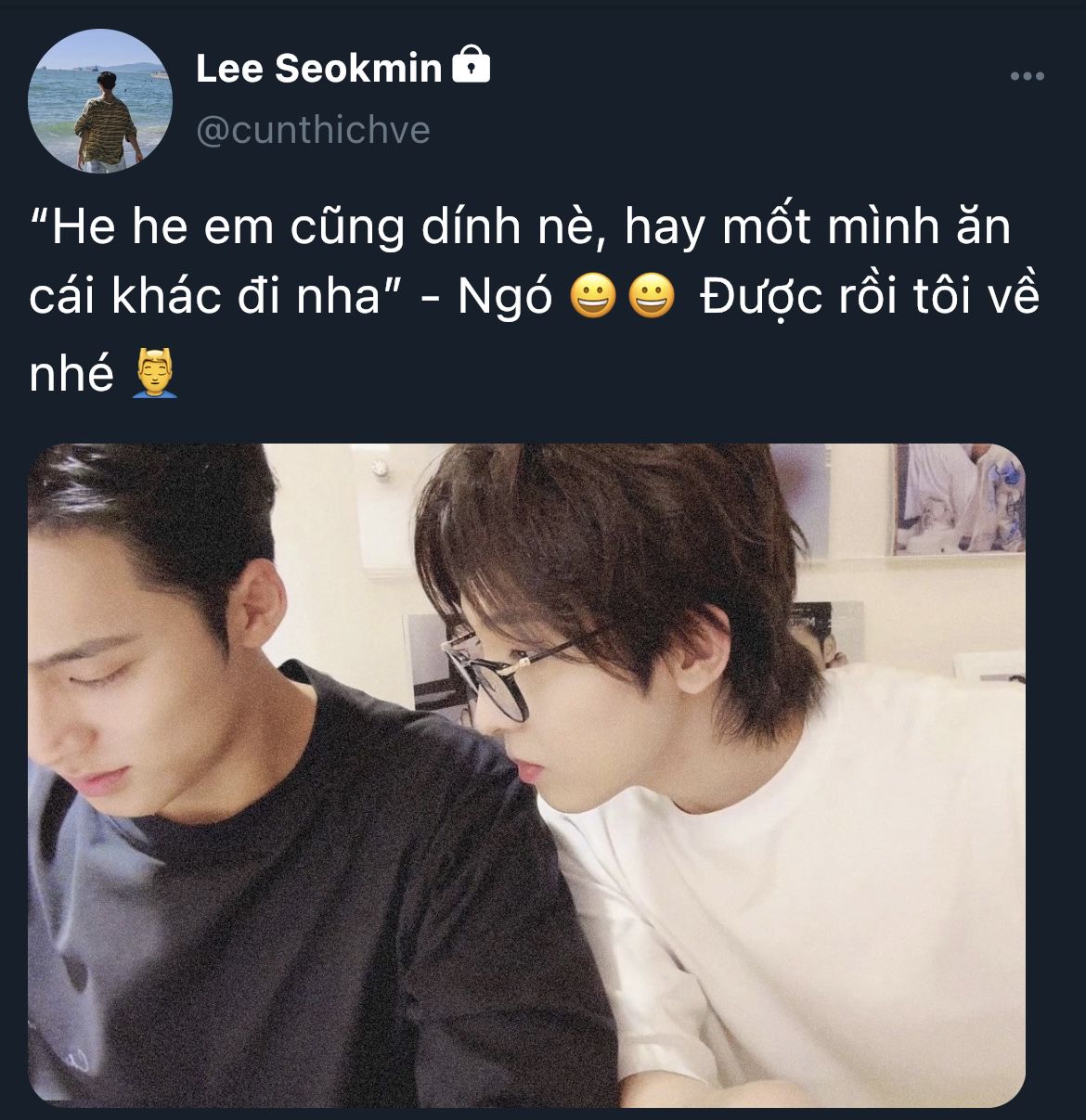 "Người bệnh mà trông hồng hào dữ ha, còn vào bếp nấu ăn.." Seokmin ngồi xuống sofa phòng khách nhìn vào gian bếp hai người đang chuẩn bị dang dở.