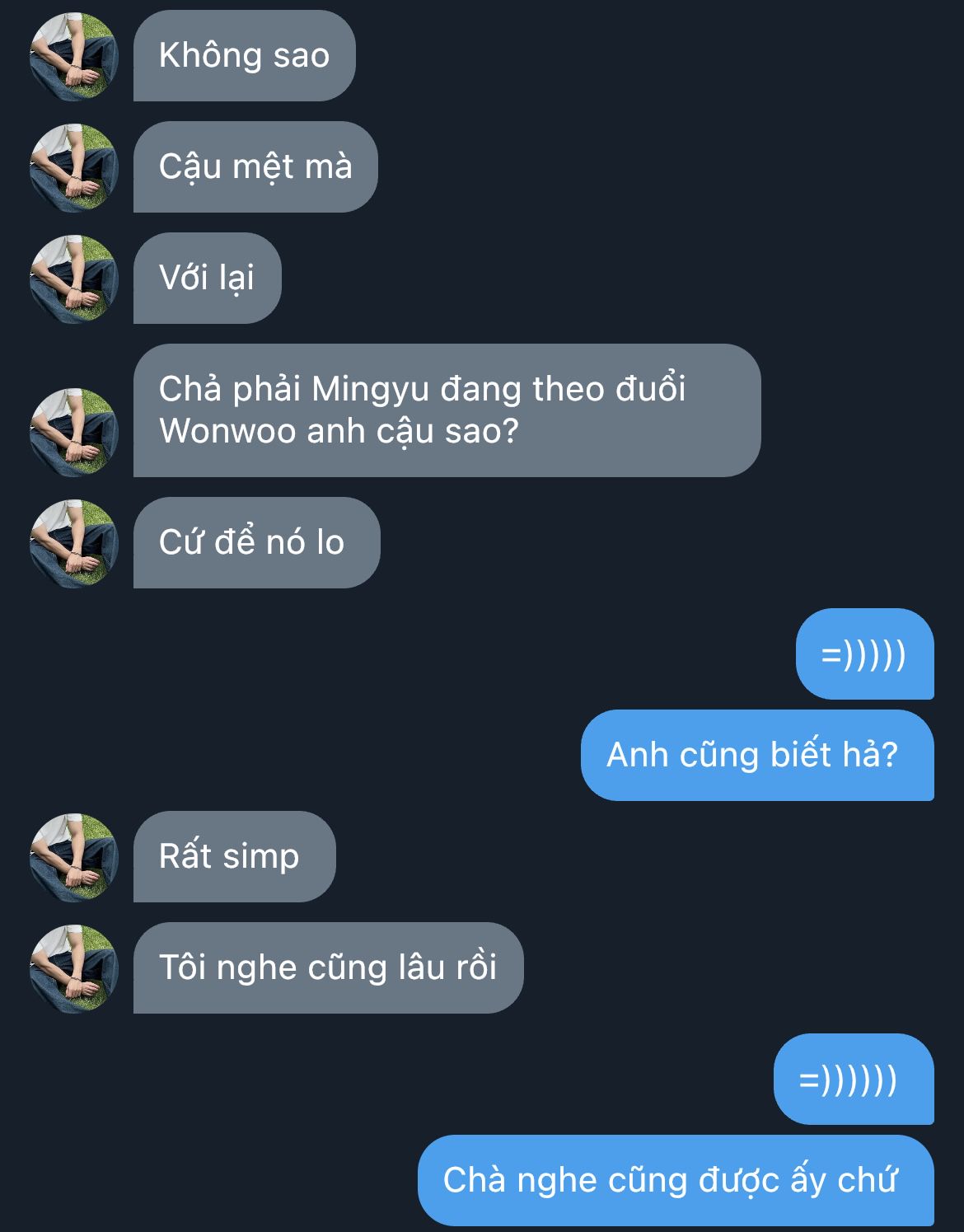 Mingyu đưa tay bịt miệng cậu bạn nhiều chuyện này lại, Wonwoo thì giả vờ quay lưng đi lấy nước, giấu nụ cười ngại ngùng không chịu nổi.