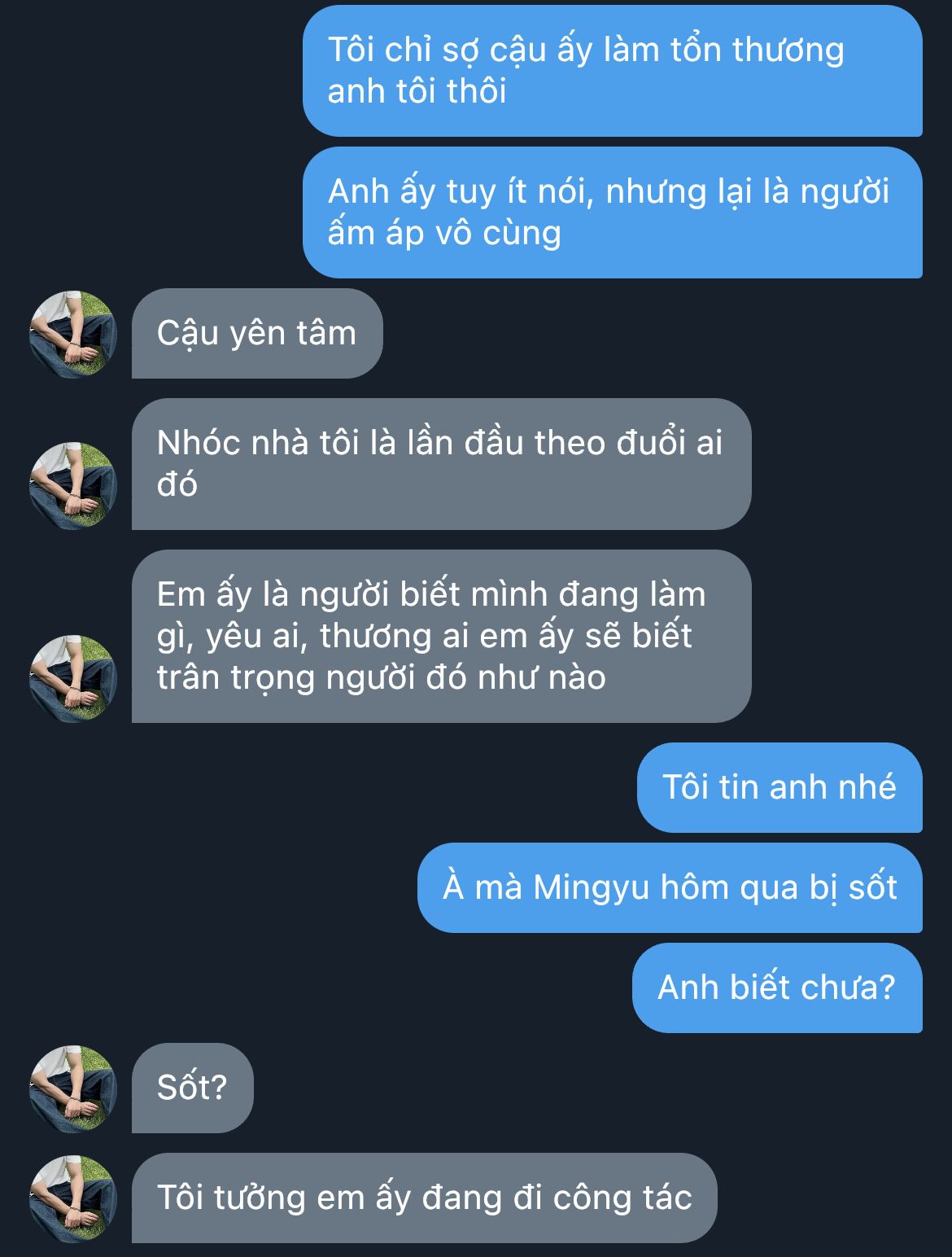 "À... xin lỗi. Tôi tưởng là điện thoại của Mingyu... em ấy đang ngủ..."