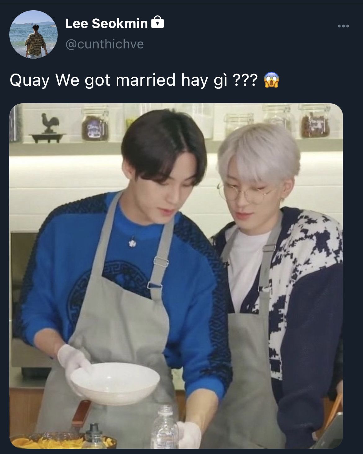 "Uống nước ép rồi im đi giùm cái, fen đến giờ này cũng khéo quá cơ" Mingyu nhét ly nước vào tay Seokmin, quay lưng vào bếp với Wonwoo.