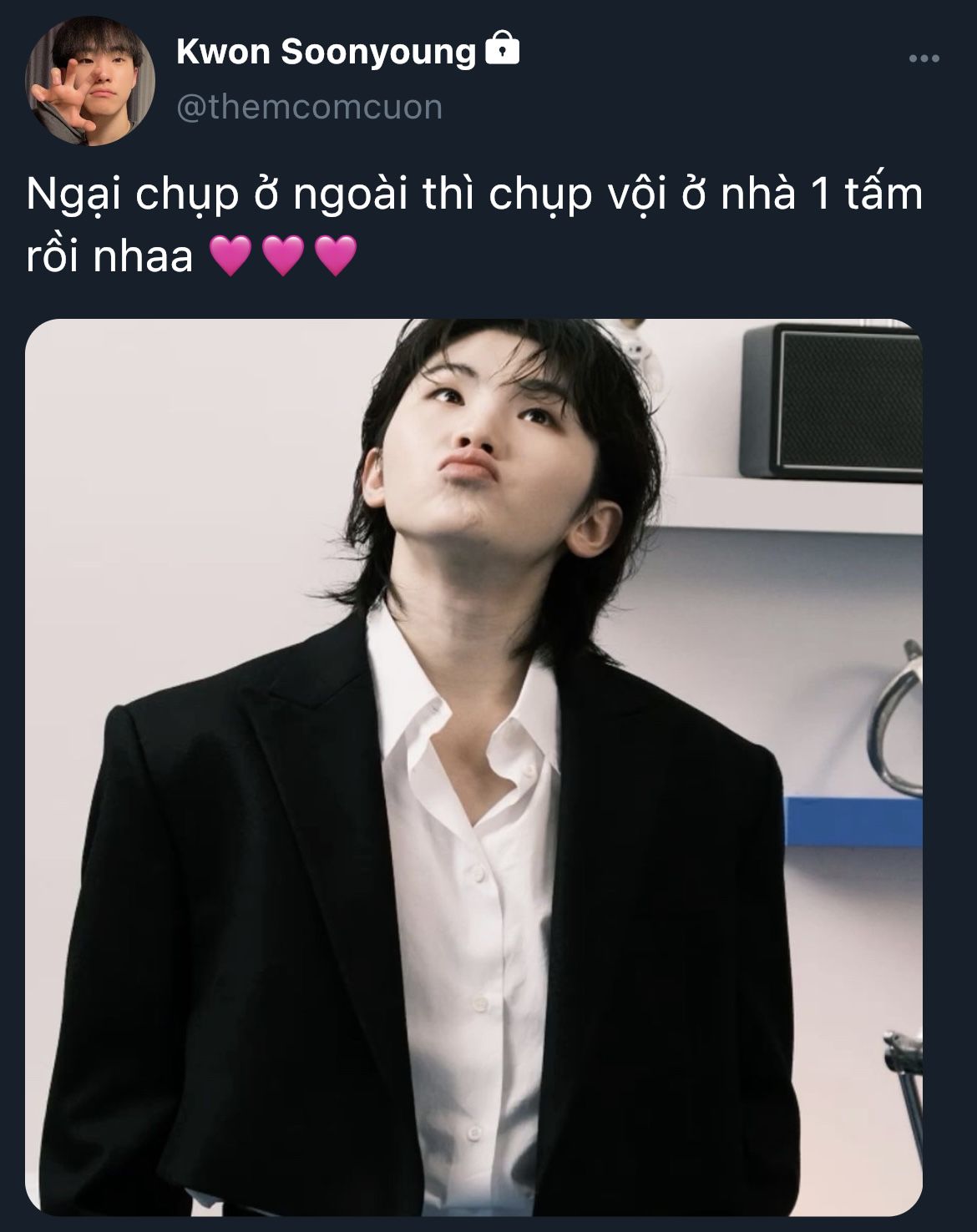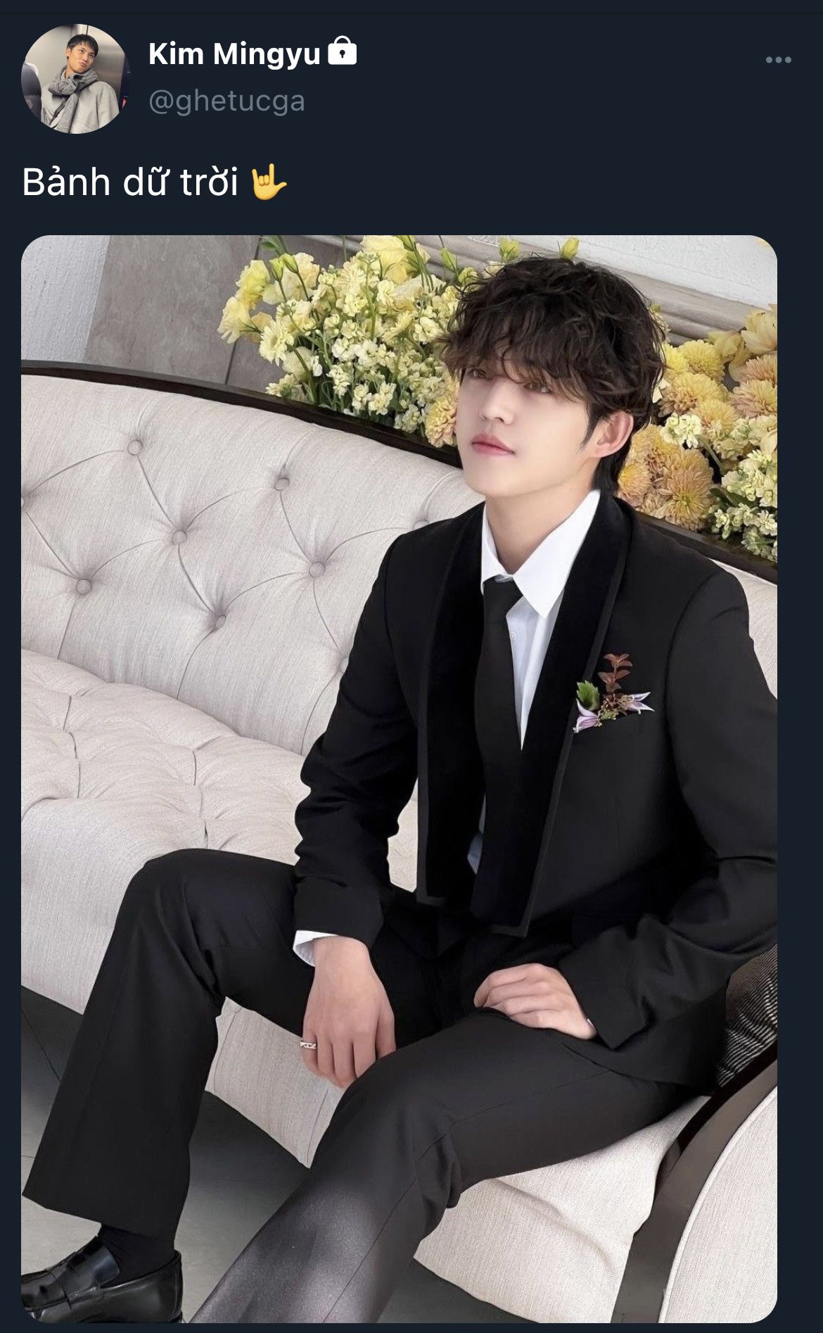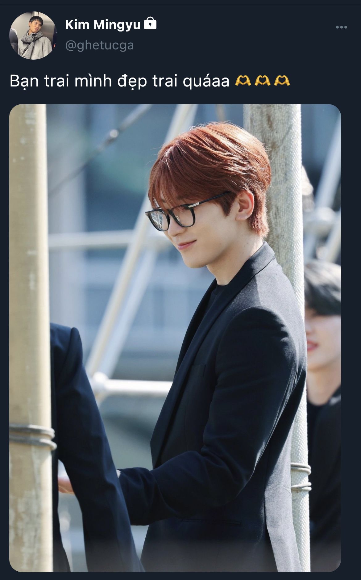 Mingyu ngồi giữa hai người, tựa nhẹ đầu vào vai người yêu, giọng nửa đùa nửa thật: