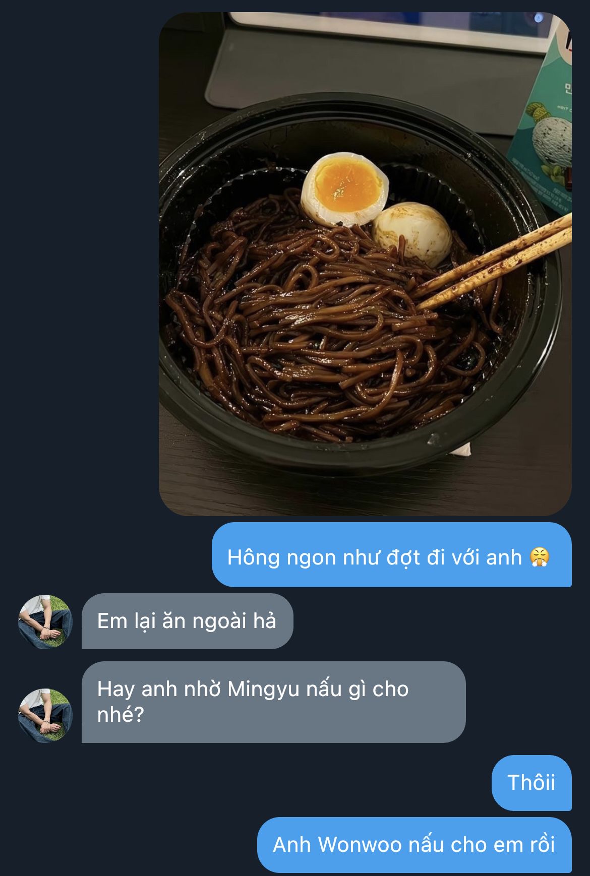 Mingyu đưa thêm một miếng bánh qua cho anh, nói nhỏ: