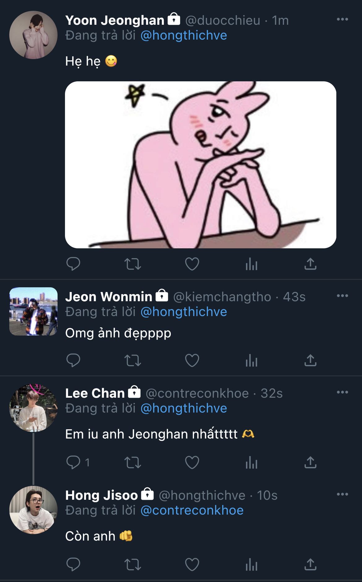 Khi tách ra, hơi thở cả hai vẫn còn quyện vào nhau. Mingyu khẽ tựa trán vào trán anh: