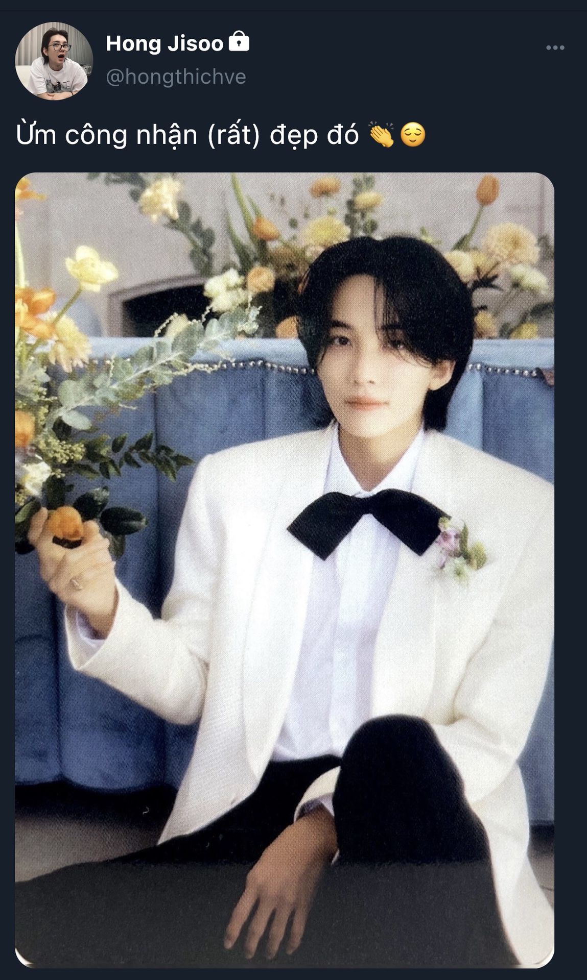 Trong bộ vest trắng ngà, áo sơ mi mỏng nhẹ, tóc buông lơi, ánh sáng xuyên qua kính khiến anh như phát sáng. Jeonghan không cười quá nhiều, chỉ mím môi nhìn về phía Seungcheol, người đang đứng chờ dưới mái vòm kết từ hàng trăm cành sơn trà trắng và lavender tím nhạt. Ánh mắt của họ khi chạm vào nhau, như gió mùa hạ vừa về sau một mùa đông dài.