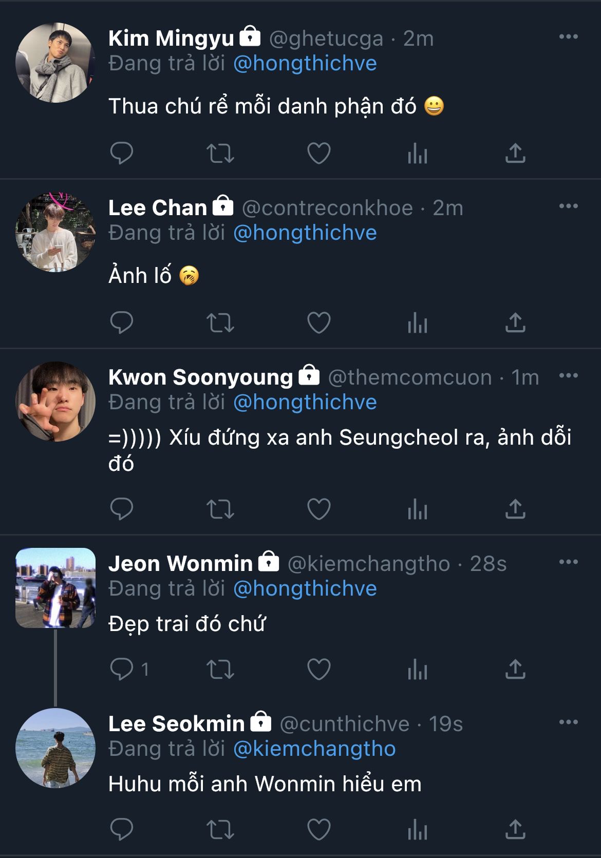 Minguk không trả lời, chỉ cười. Ánh mắt anh chệch qua cửa sổ, nơi nắng bắt đầu ngả xuống mái nhà bên cạnh. Bất giác, anh thở ra một hơi thật khẽ, Wonwoo thấy, nhưng không nói gì.